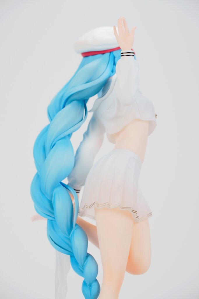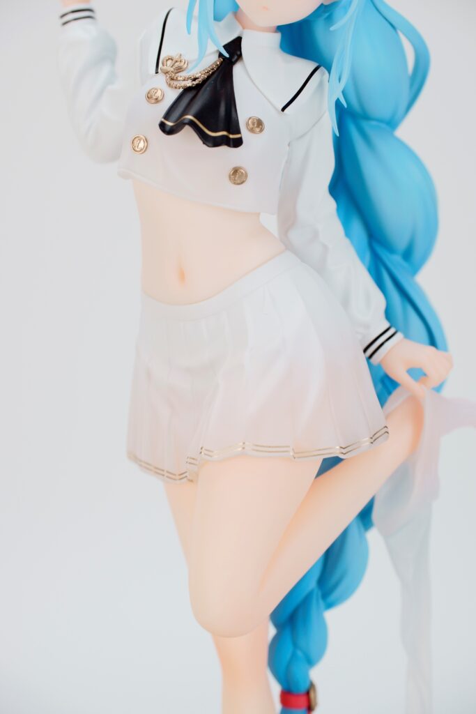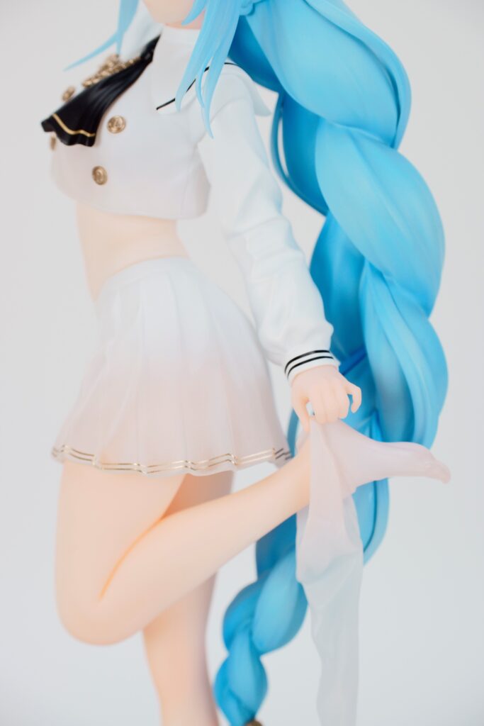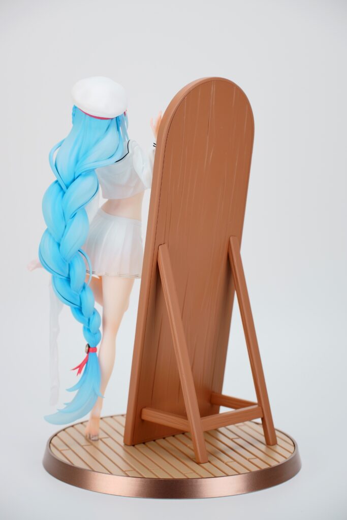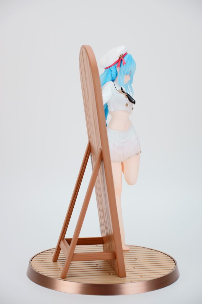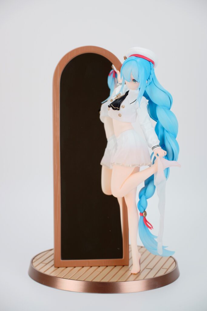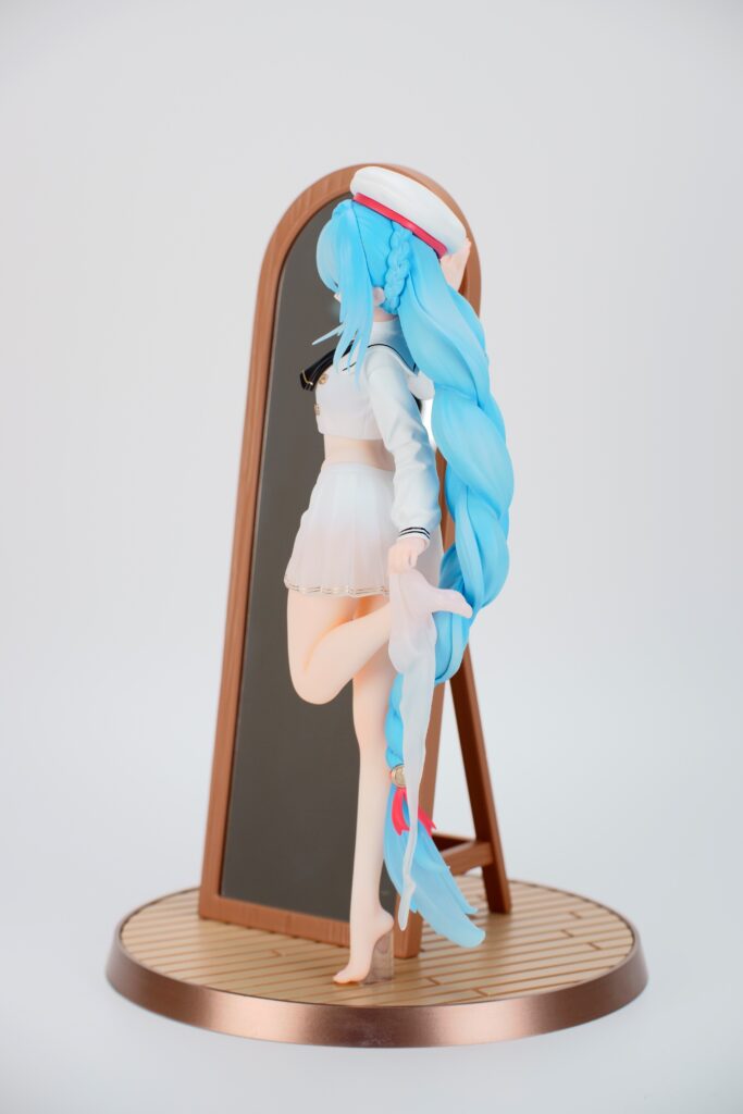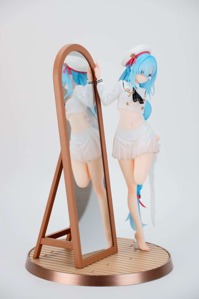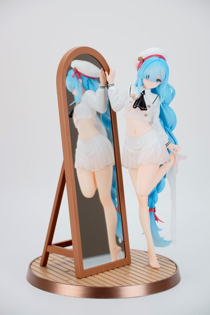 片手を全身鏡に添え、少し困ったような恥ずかしげな表情を浮かべるジェーナスの姿を立体化。へそ出しセーラー服からのぞく素肌は淡く上気し、脱ぎかけの白いタイツから覗く素足は、軽やかに浮かせたポーズで造形。三つ編みの青髪は肩から自然に垂れ落ち、毛先にかけてのグラデーション塗装が透明感を引き立てます。