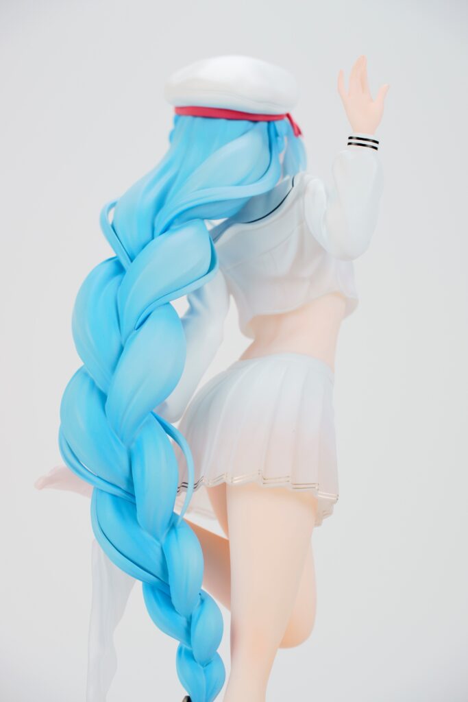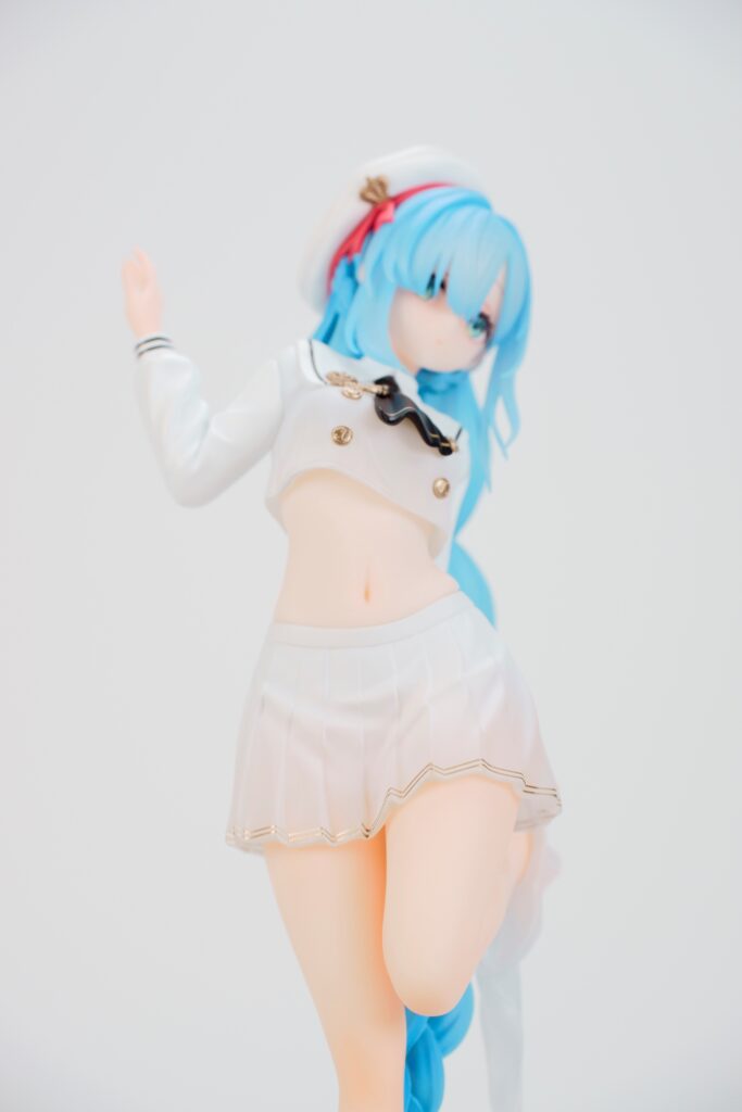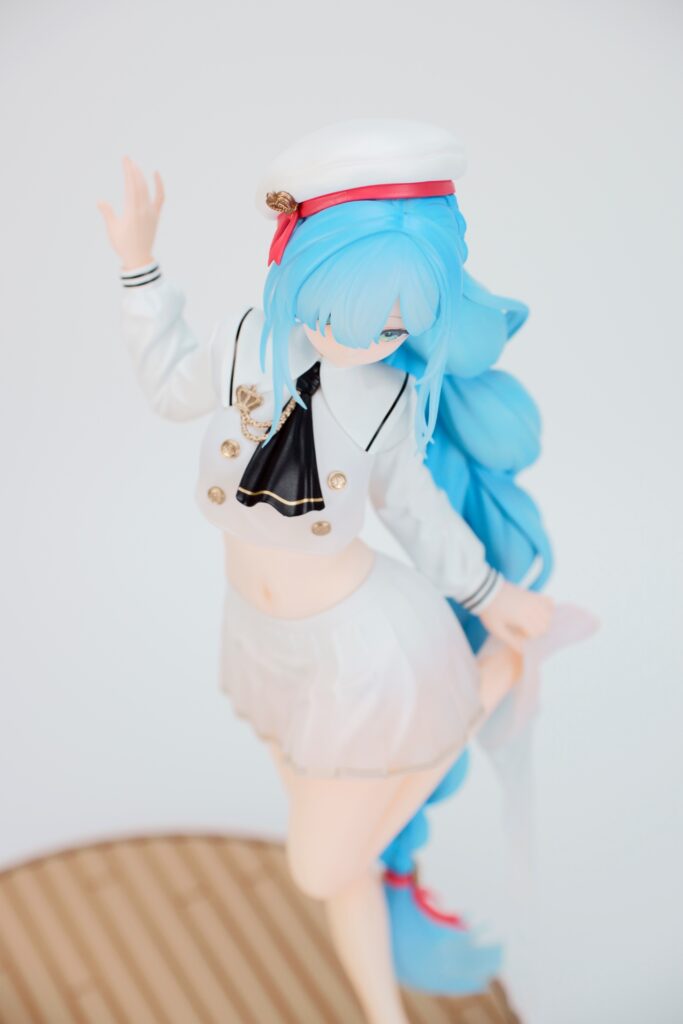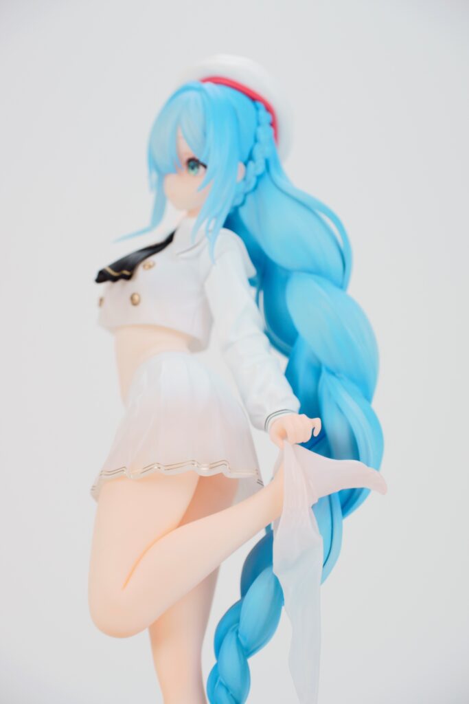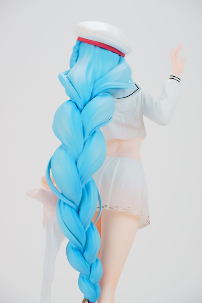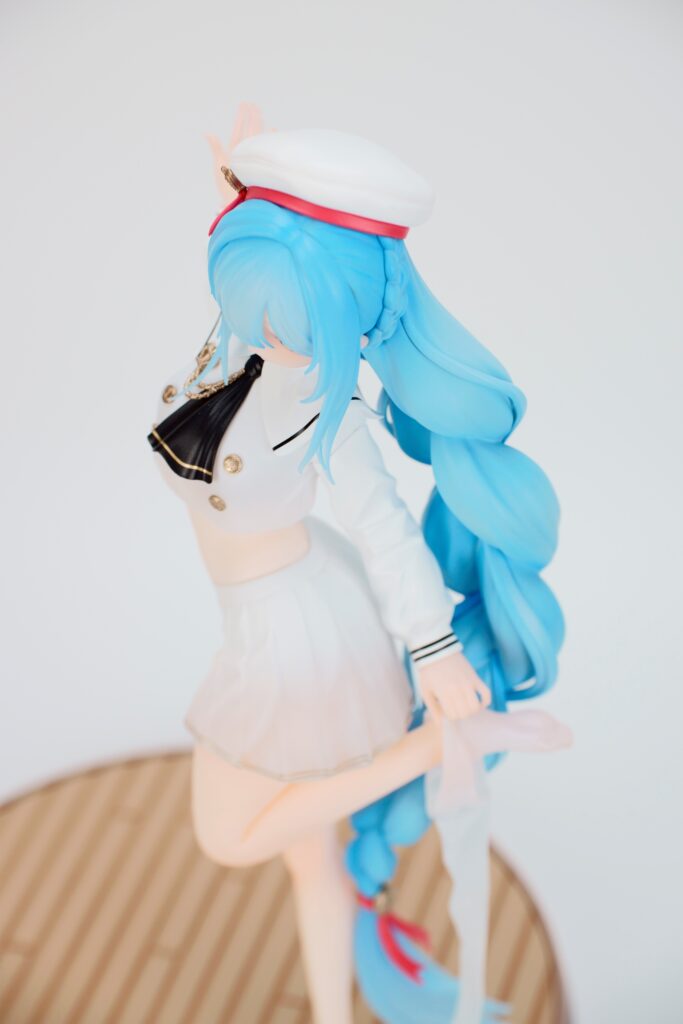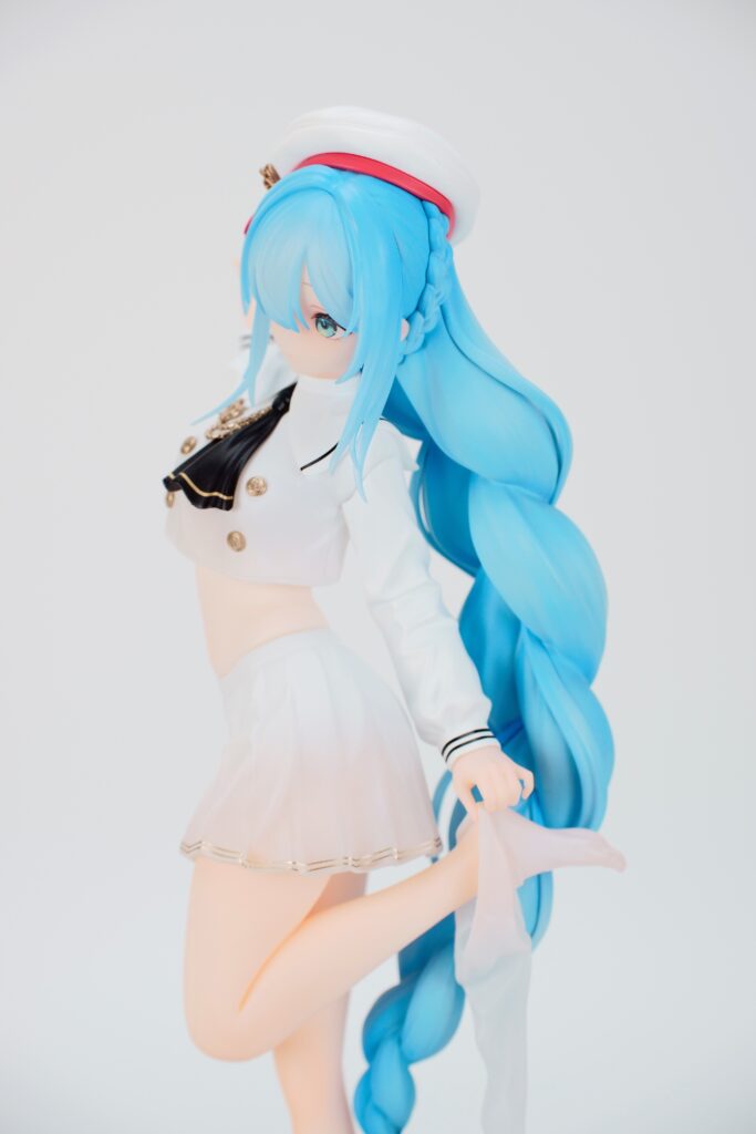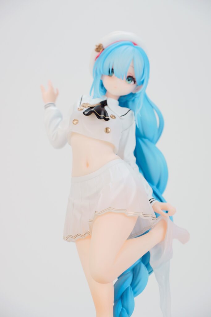片手を全身鏡に添え、少し困ったような恥ずかしげな表情を浮かべるジェーナスの姿を立体化。へそ出しセーラー服からのぞく素肌は淡く上気し、脱ぎかけの白いタイツから覗く素足は、軽やかに浮かせたポーズで造形。三つ編みの青髪は肩から自然に垂れ落ち、毛先にかけてのグラデーション塗装が透明感を引き立てます。