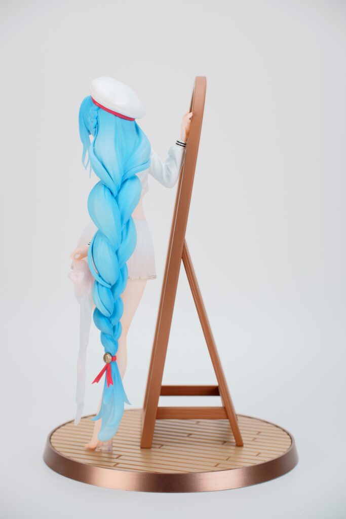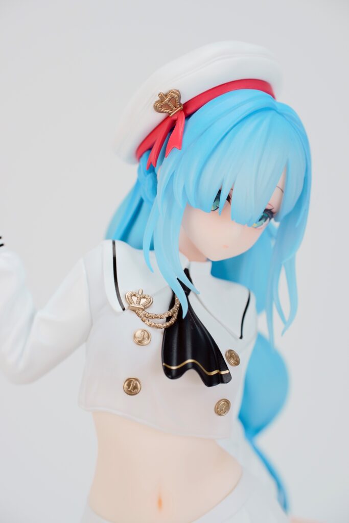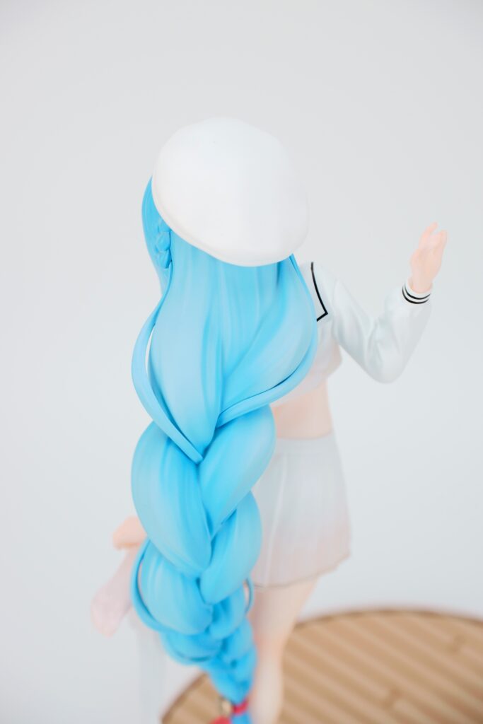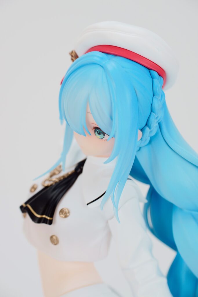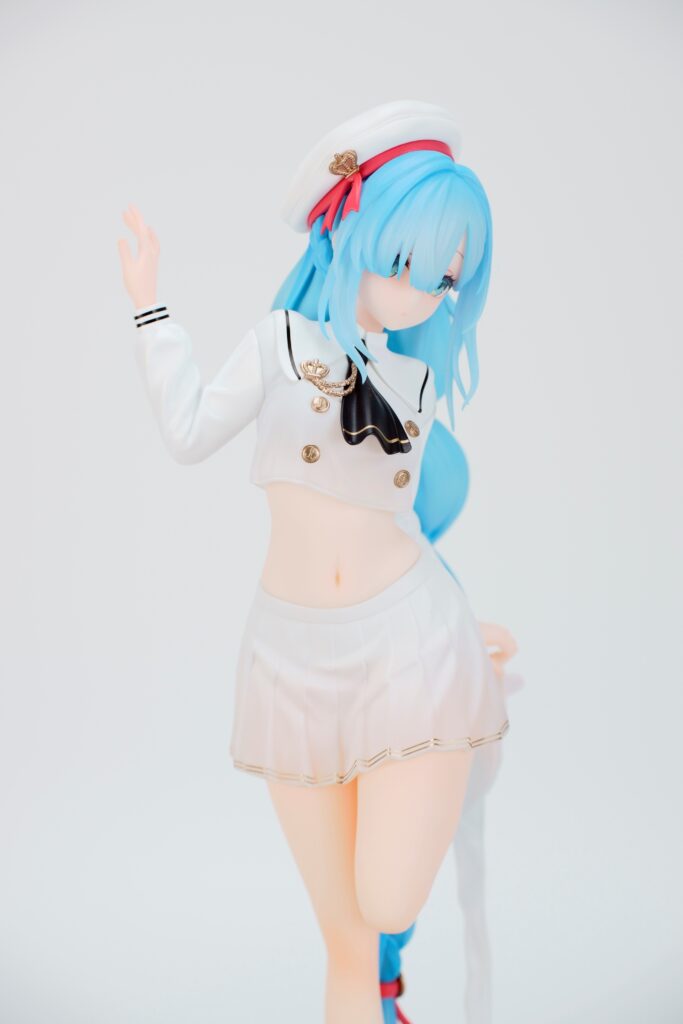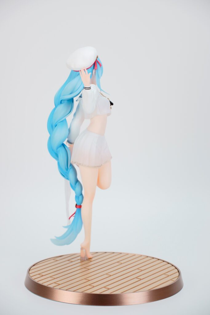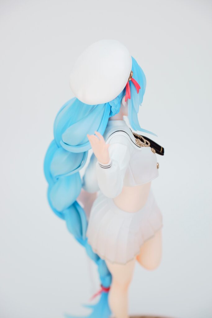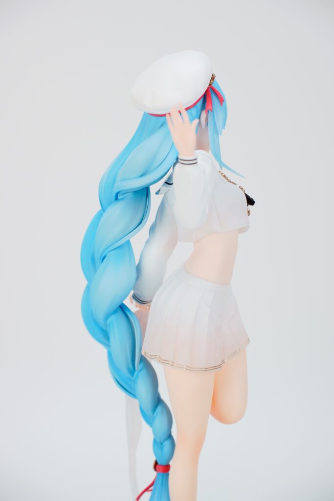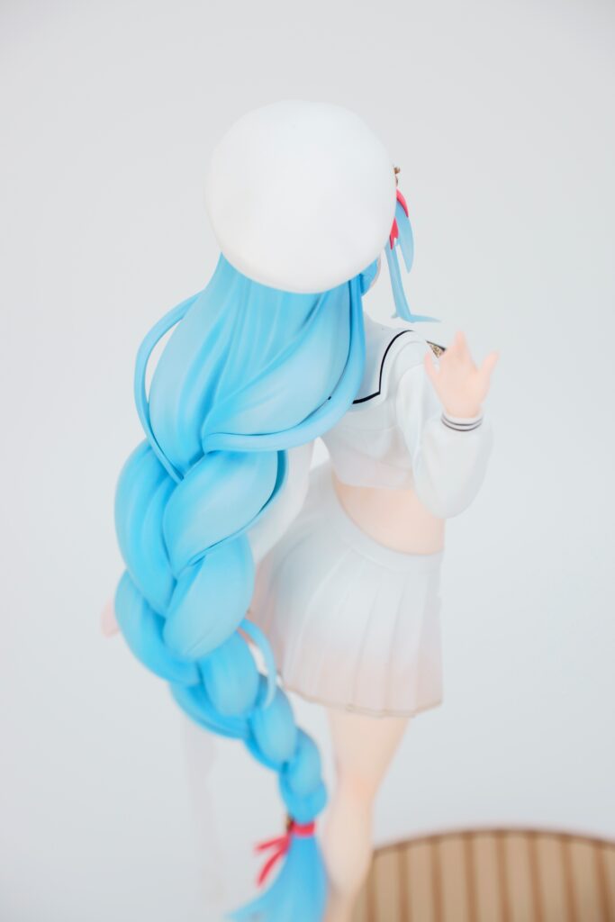 片手を全身鏡に添え、少し困ったような恥ずかしげな表情を浮かべるジェーナスの姿を立体化。へそ出しセーラー服からのぞく素肌は淡く上気し、脱ぎかけの白いタイツから覗く素足は、軽やかに浮かせたポーズで造形。三つ編みの青髪は肩から自然に垂れ落ち、毛先にかけてのグラデーション塗装が透明感を引き立てます。