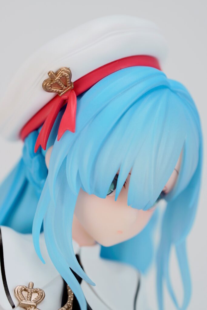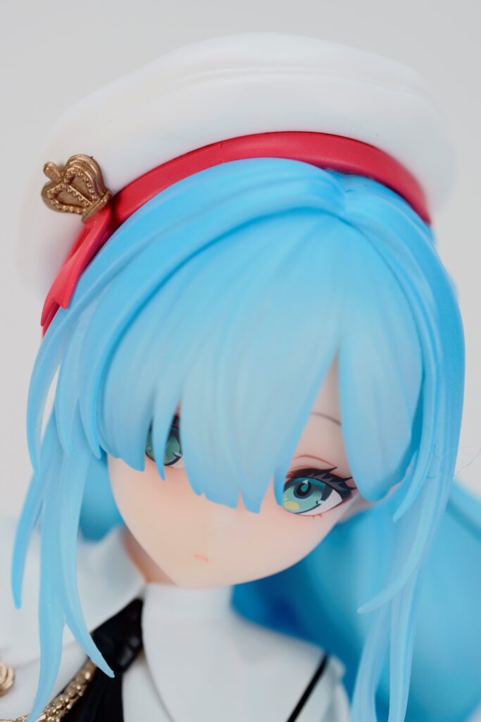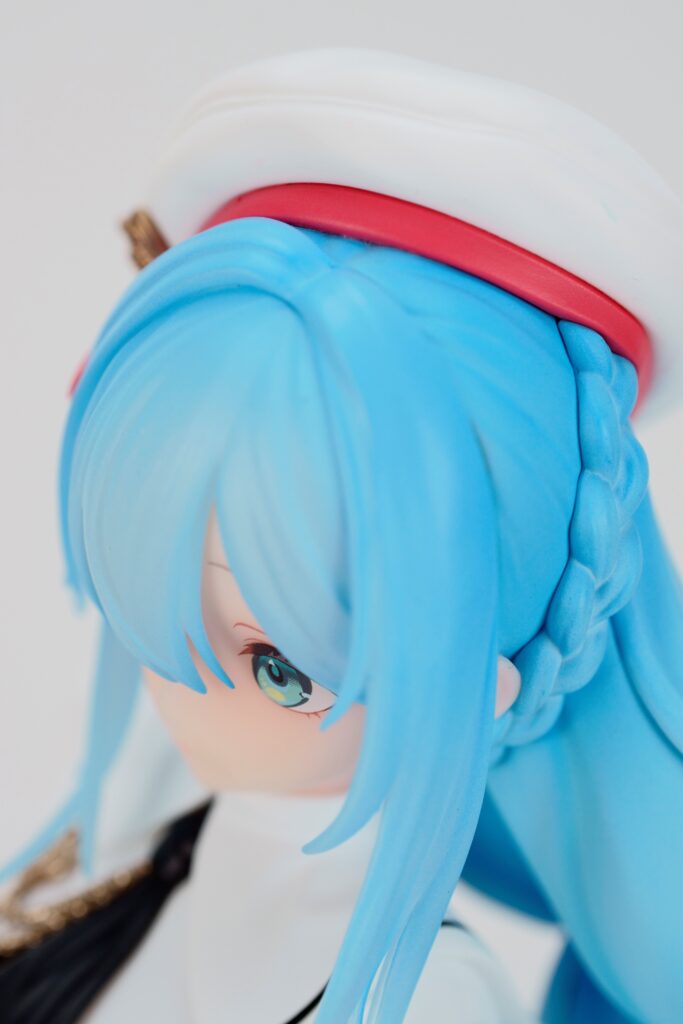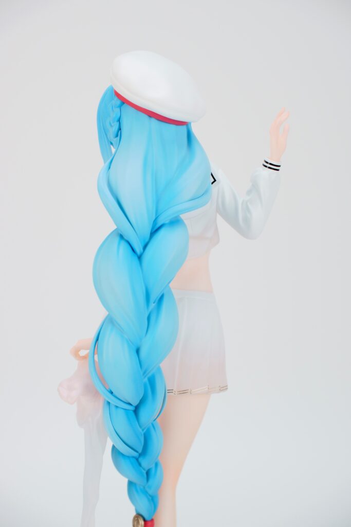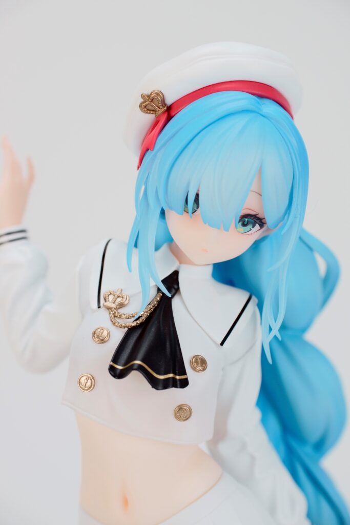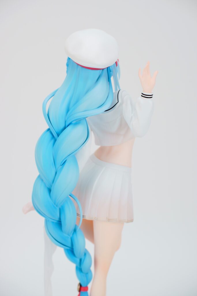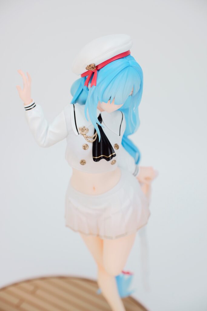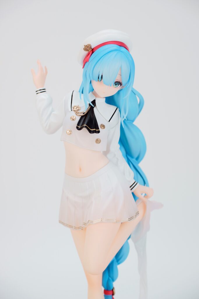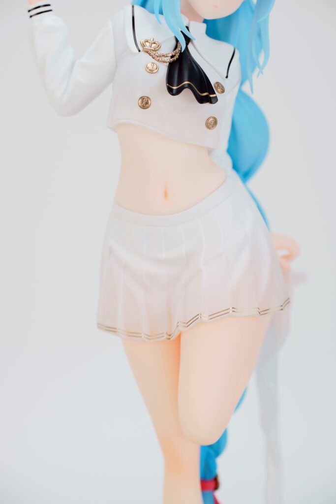 片手を全身鏡に添え、少し困ったような恥ずかしげな表情を浮かべるジェーナスの姿を立体化。へそ出しセーラー服からのぞく素肌は淡く上気し、脱ぎかけの白いタイツから覗く素足は、軽やかに浮かせたポーズで造形。三つ編みの青髪は肩から自然に垂れ落ち、毛先にかけてのグラデーション塗装が透明感を引き立てます。