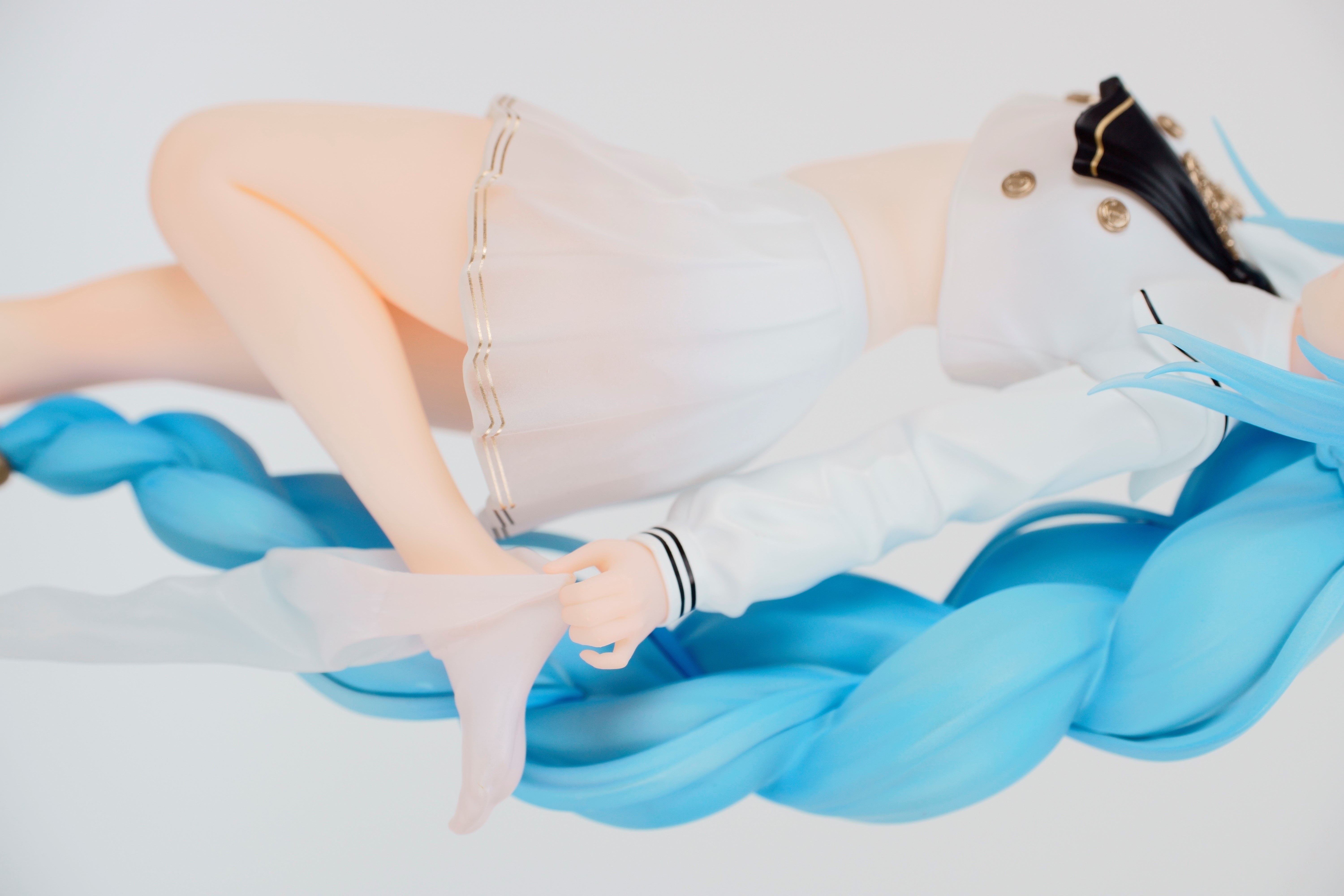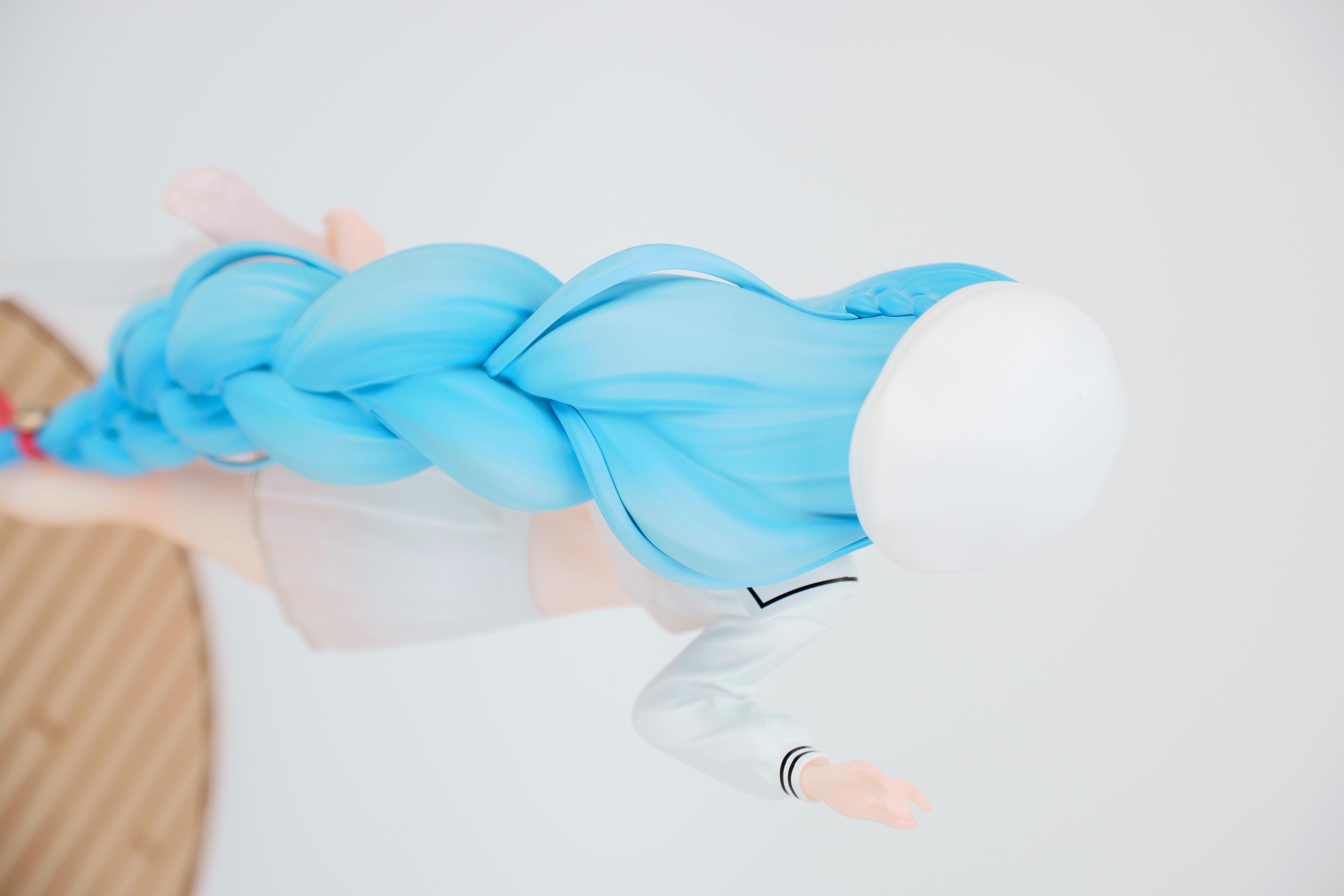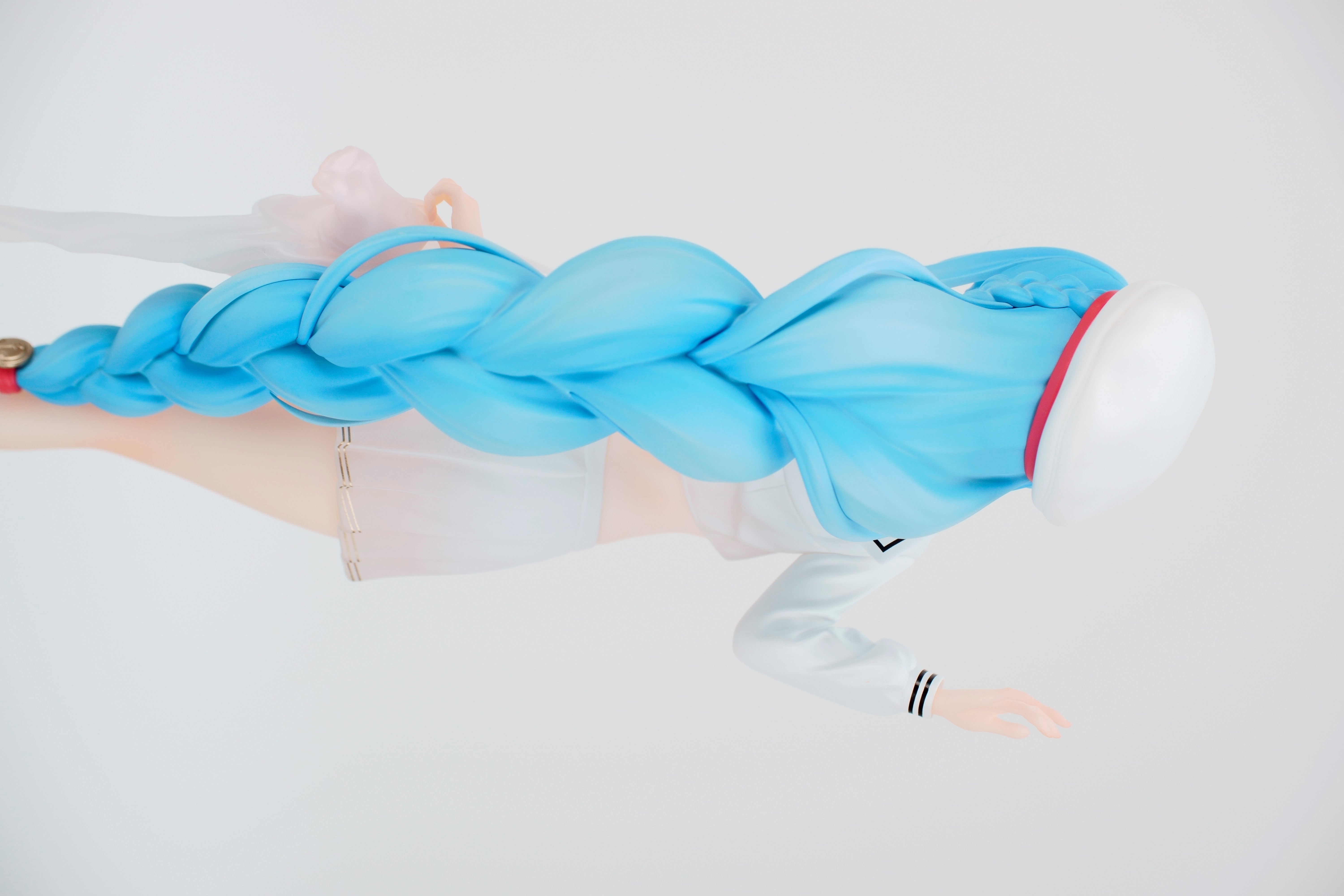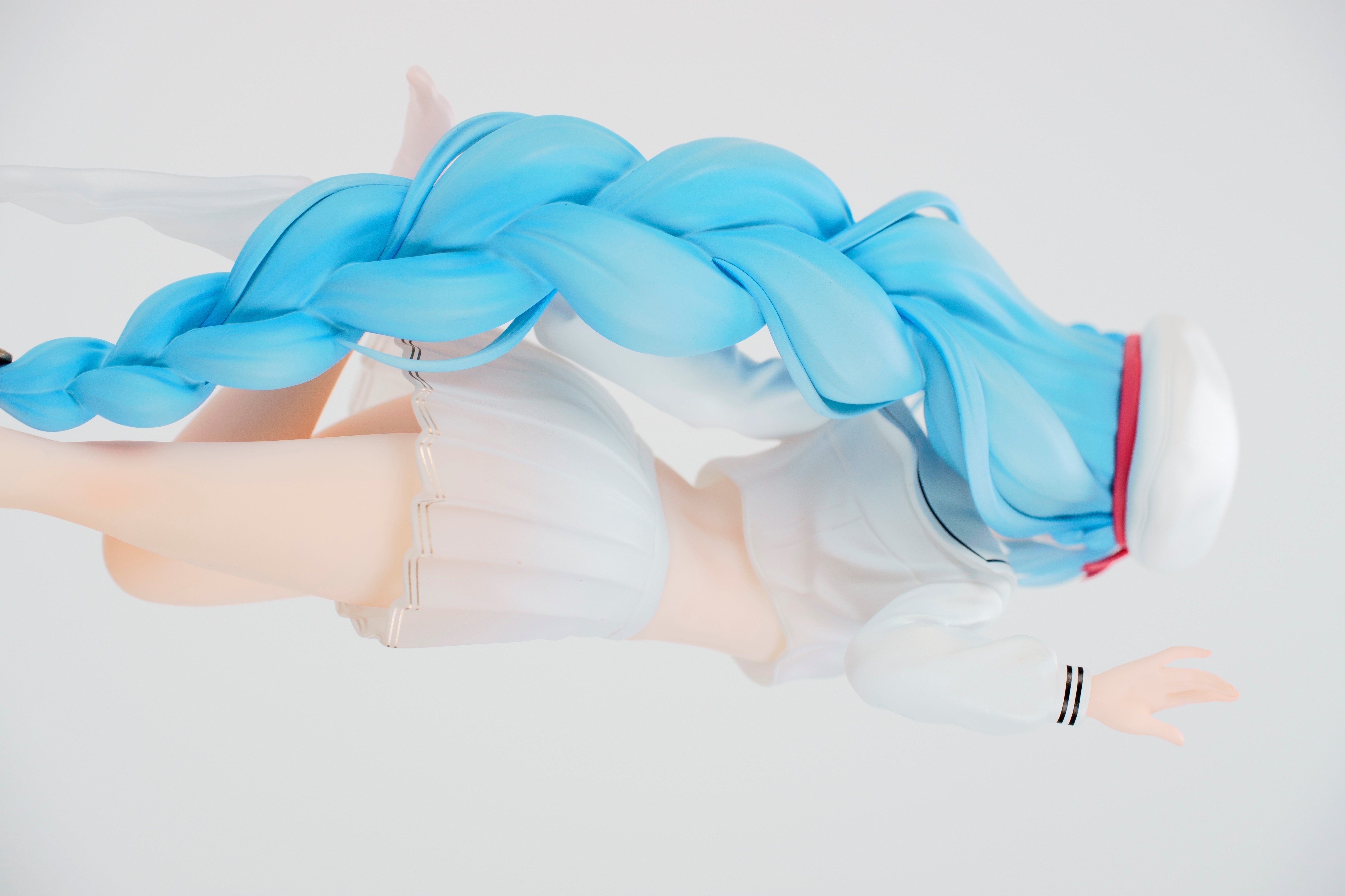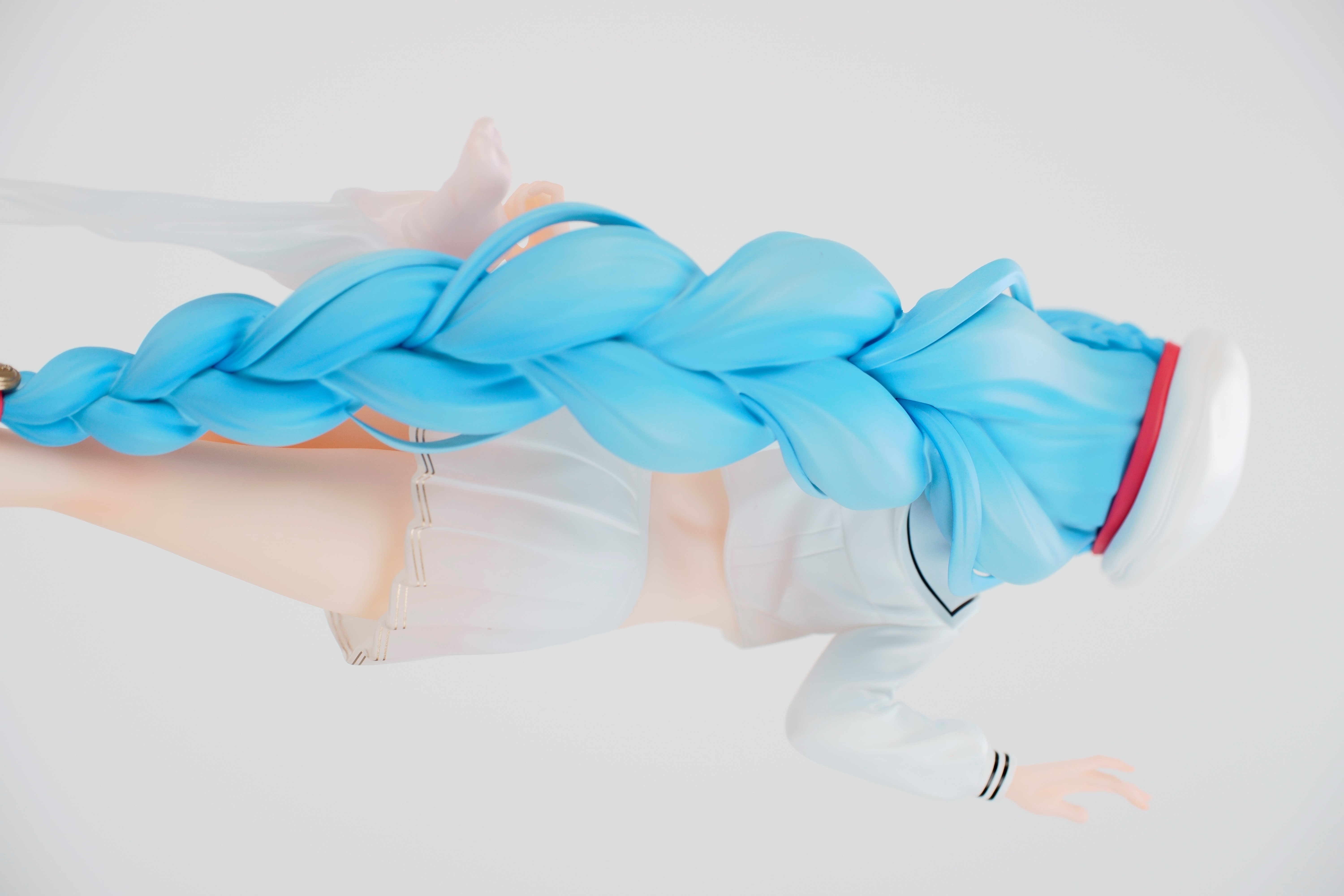 片手を全身鏡に添え、少し困ったような恥ずかしげな表情を浮かべるジェーナスの姿を立体化。へそ出しセーラー服からのぞく素肌は淡く上気し、脱ぎかけの白いタイツから覗く素足は、軽やかに浮かせたポーズで造形。三つ編みの青髪は肩から自然に垂れ落ち、毛先にかけてのグラデーション塗装が透明感を引き立てます。