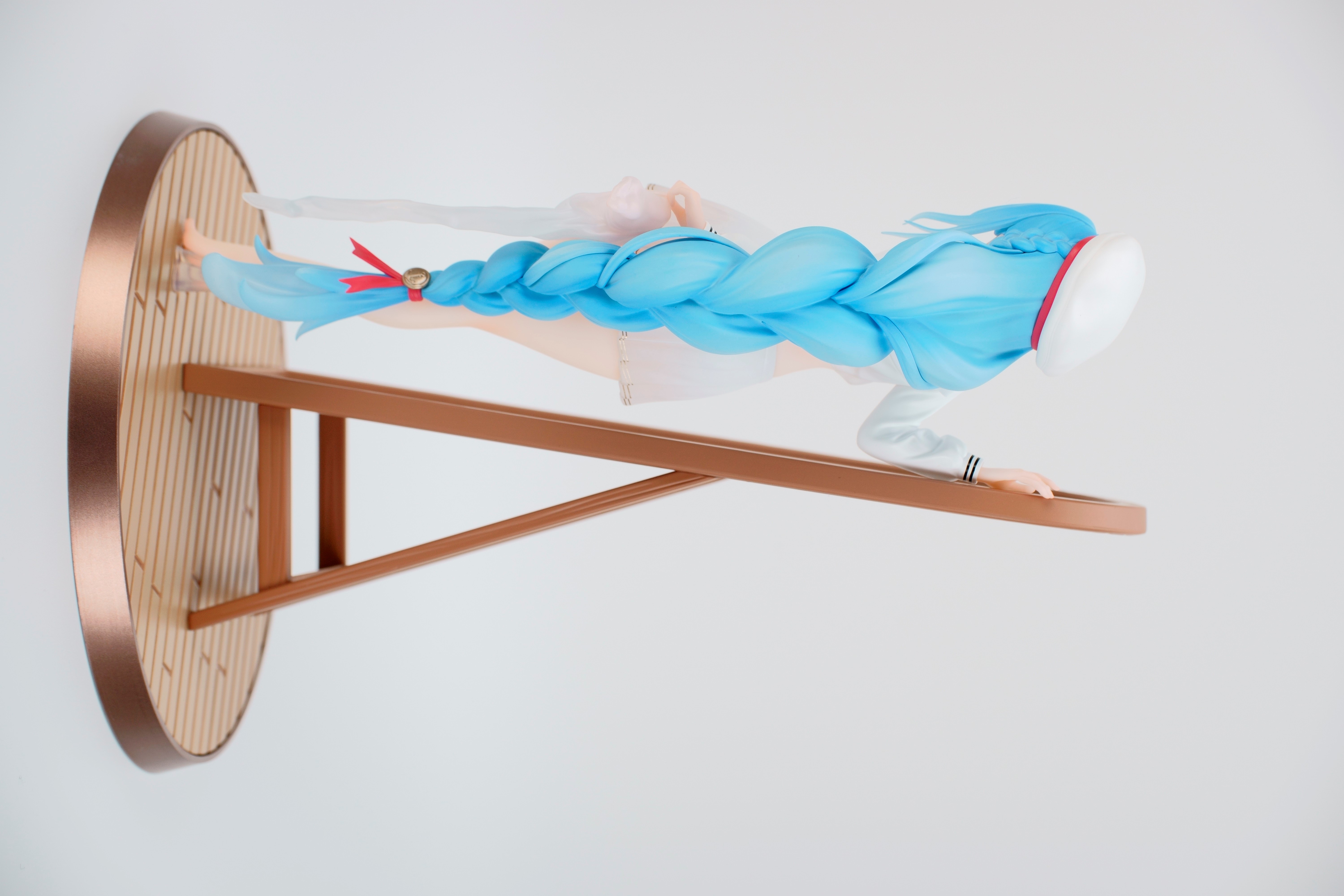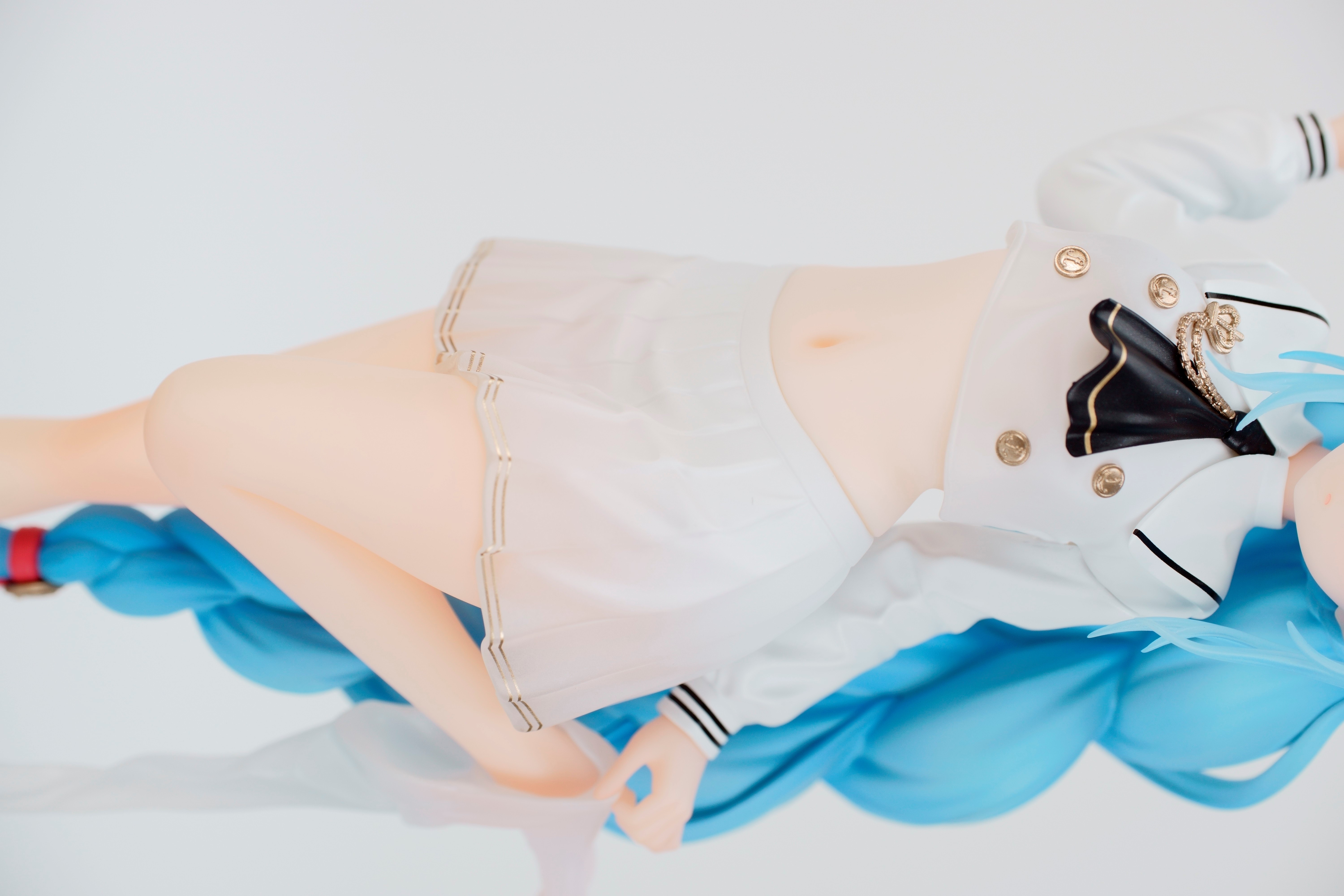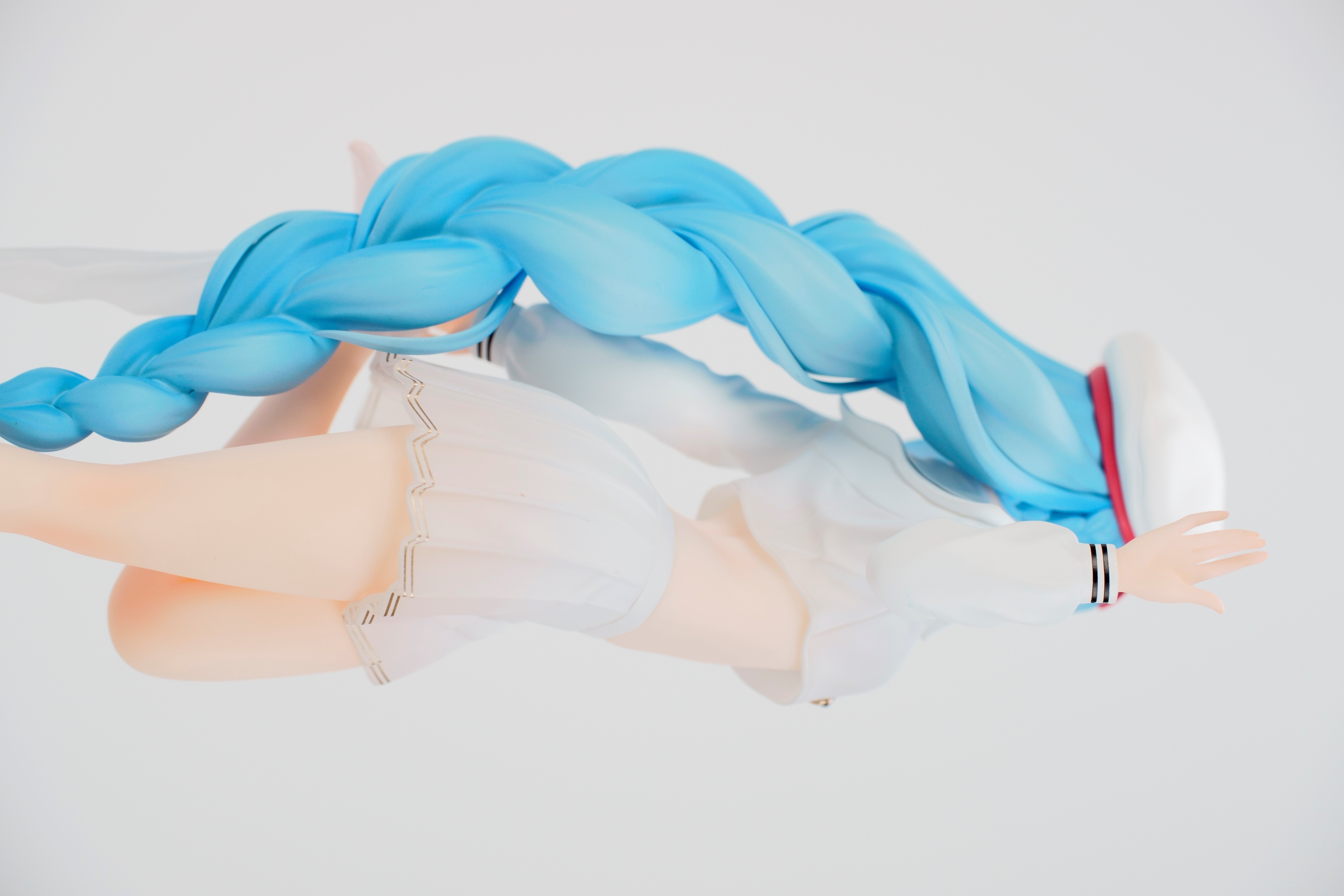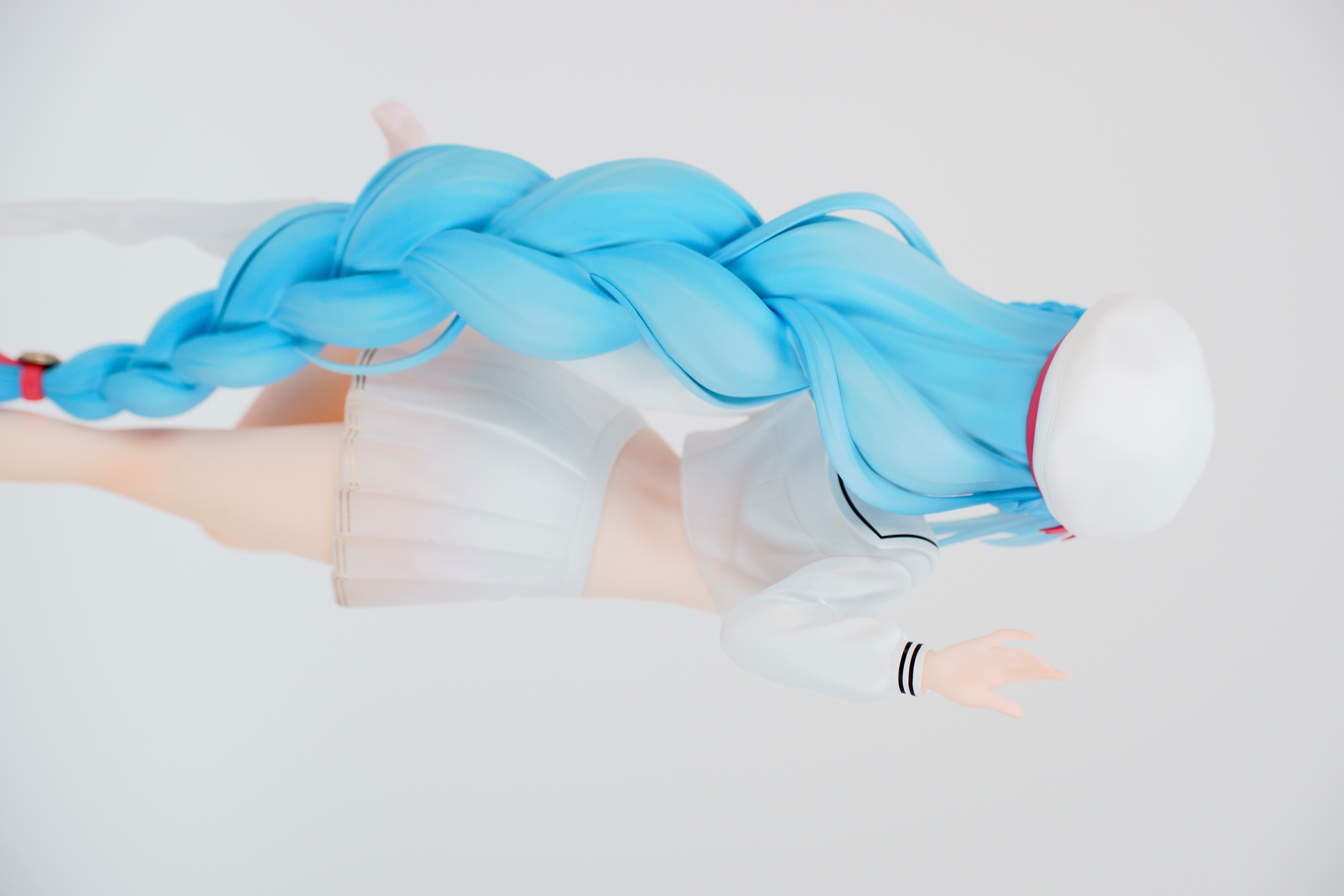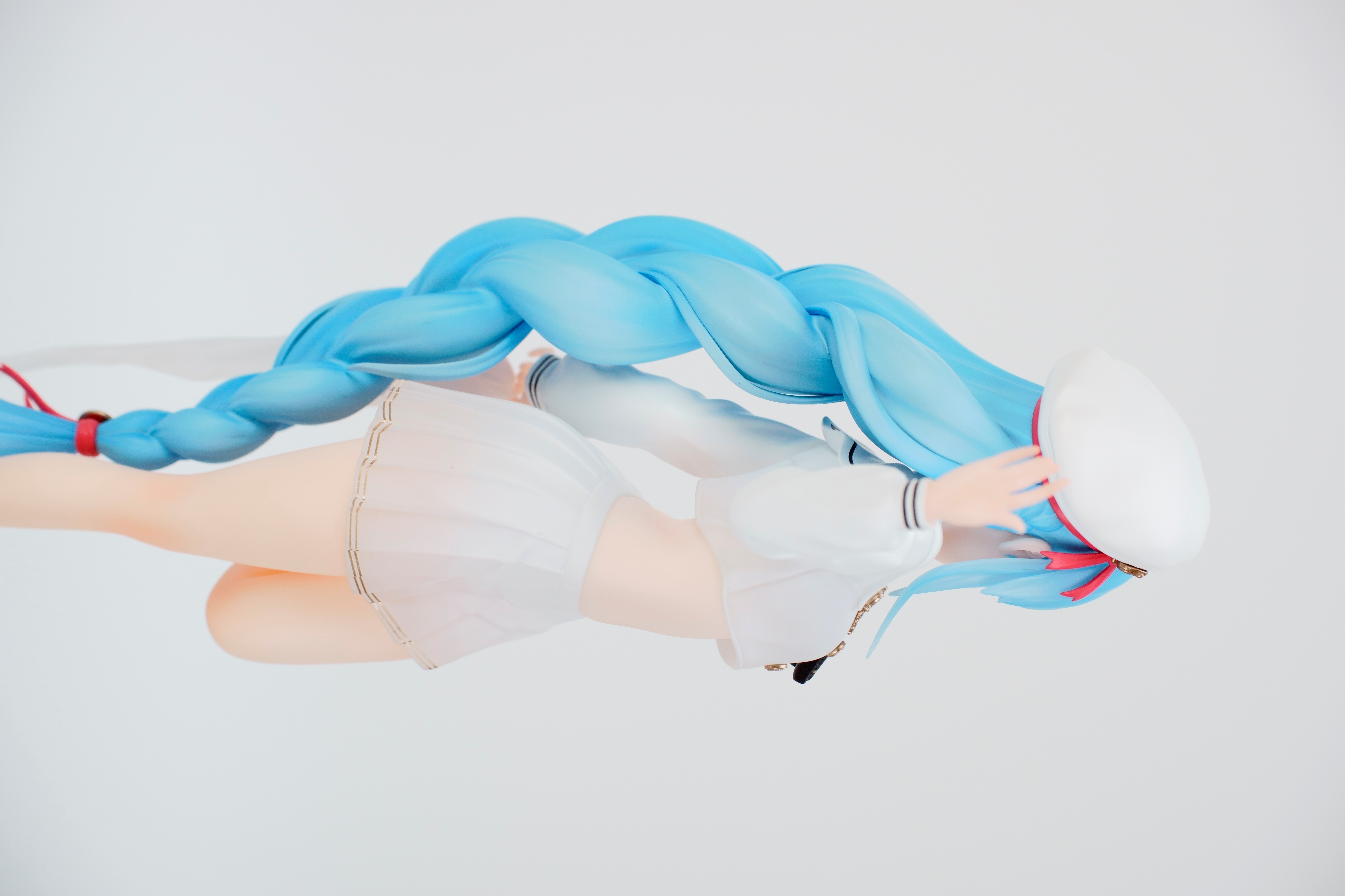 片手を全身鏡に添え、少し困ったような恥ずかしげな表情を浮かべるジェーナスの姿を立体化。へそ出しセーラー服からのぞく素肌は淡く上気し、脱ぎかけの白いタイツから覗く素足は、軽やかに浮かせたポーズで造形。三つ編みの青髪は肩から自然に垂れ落ち、毛先にかけてのグラデーション塗装が透明感を引き立てます。