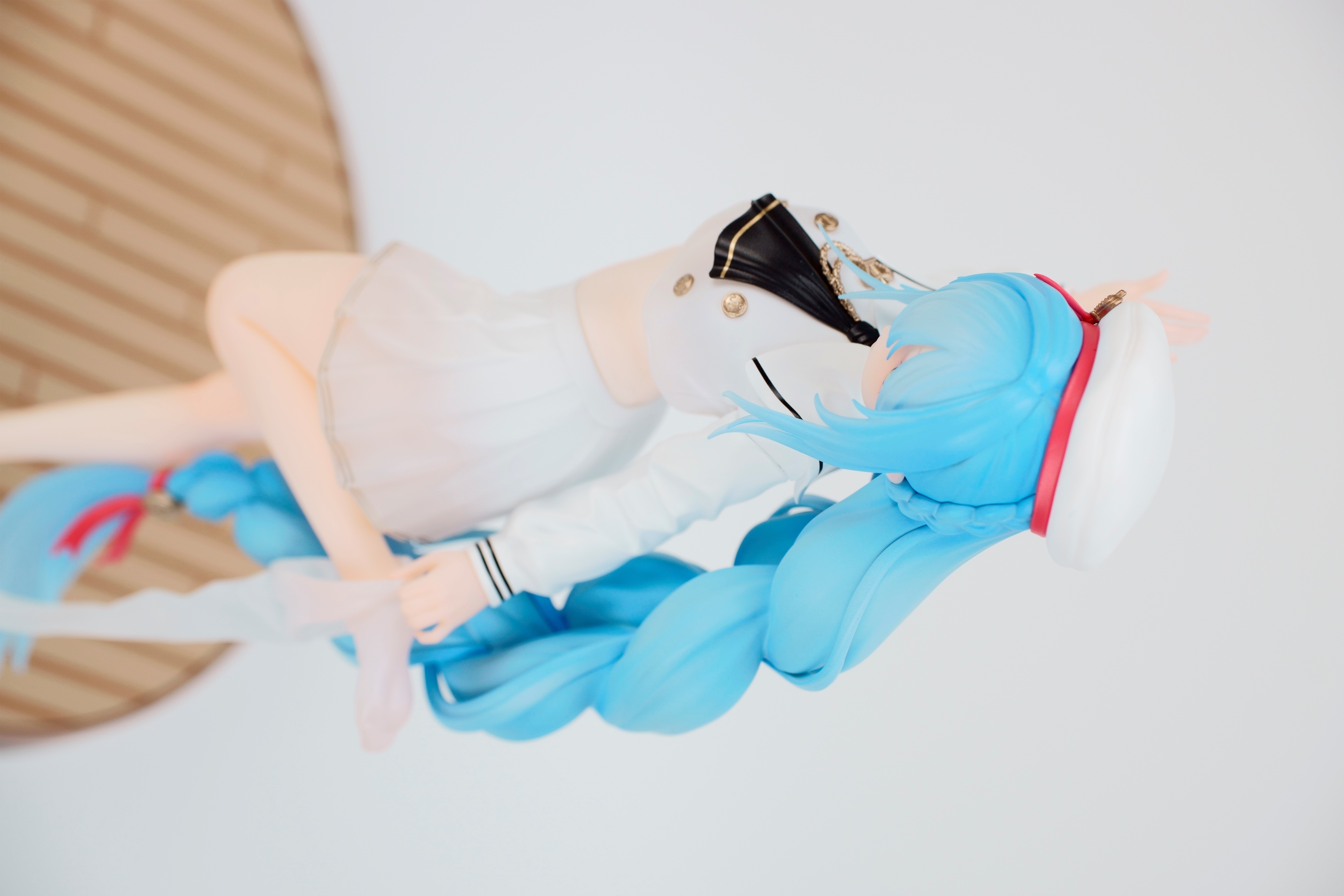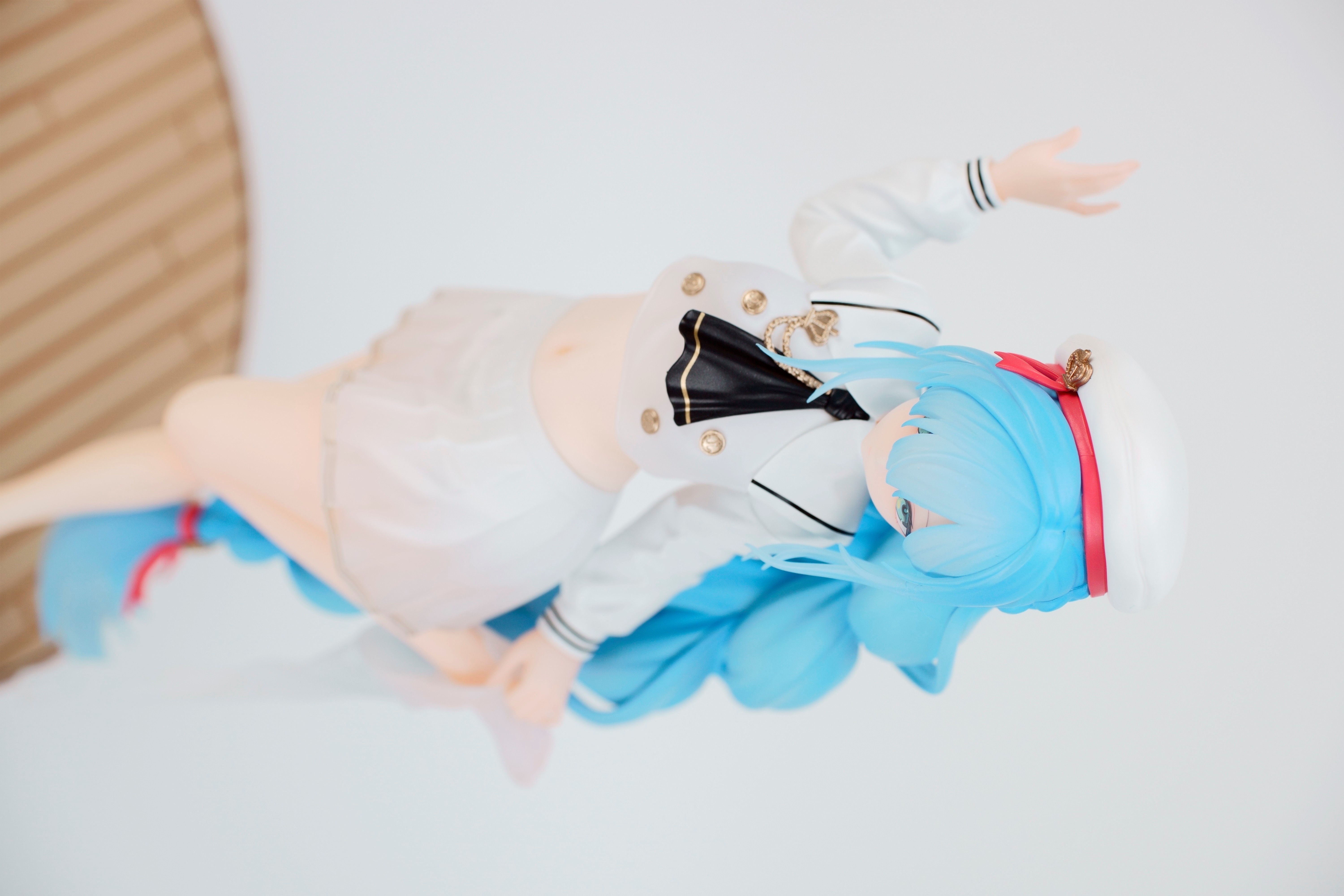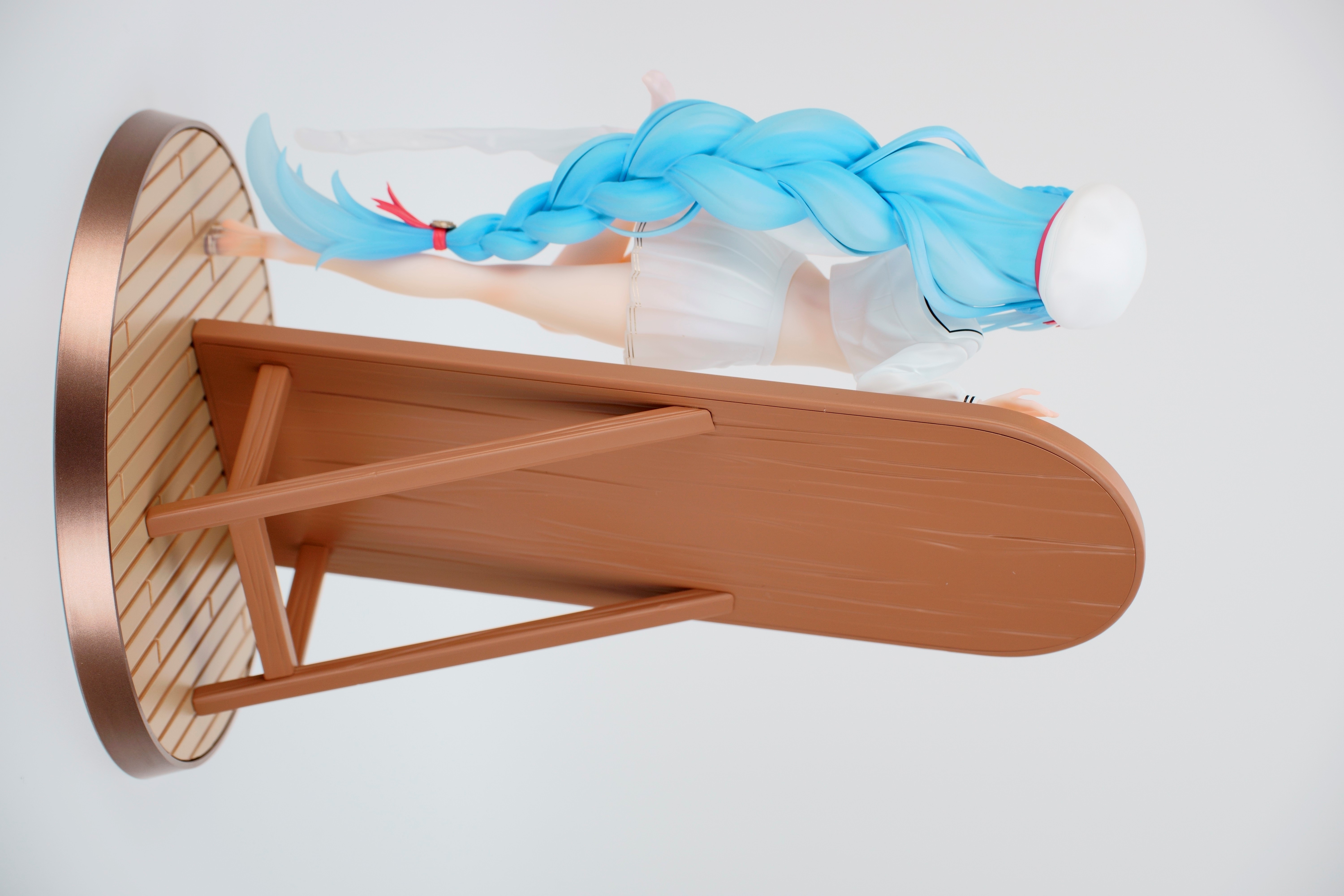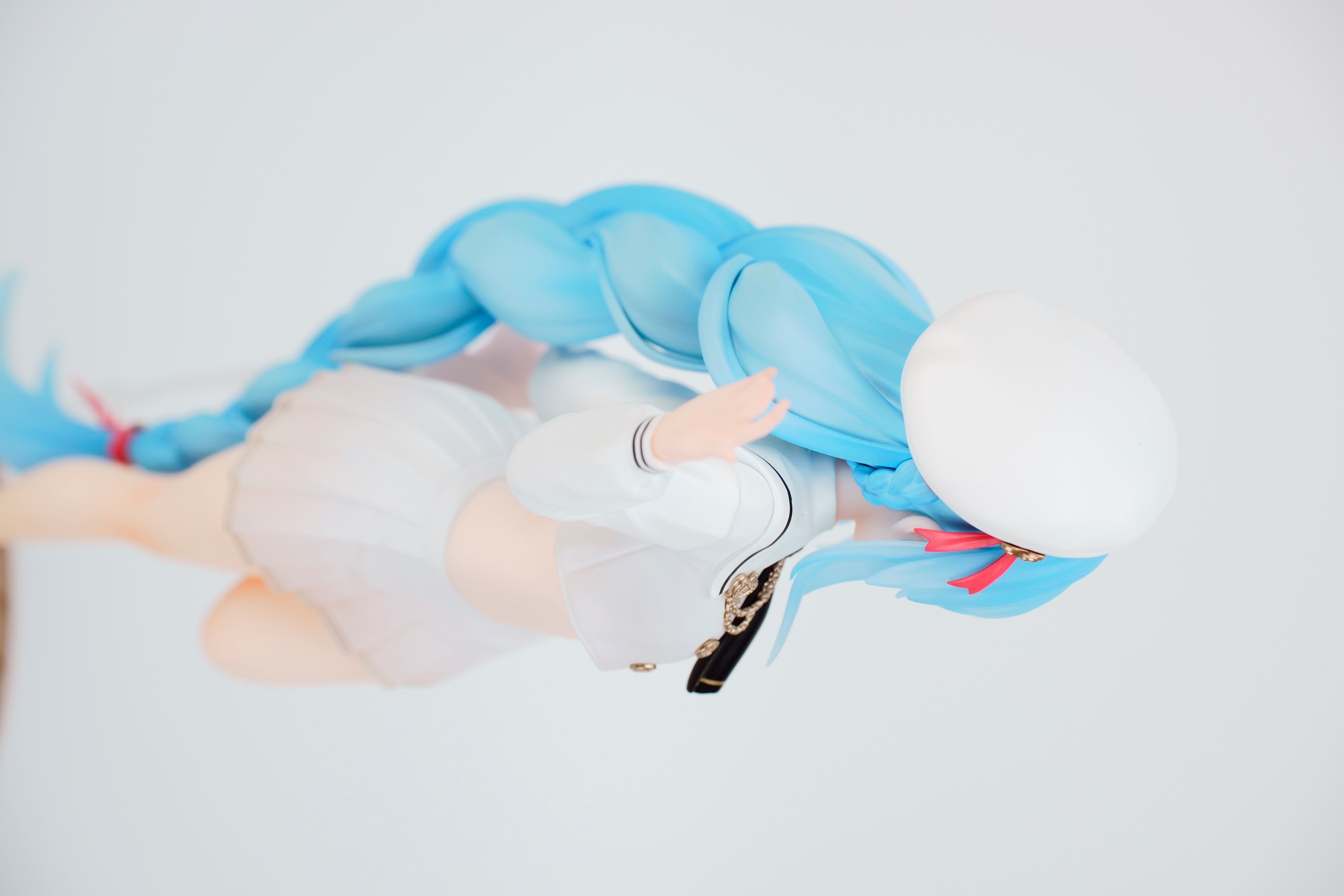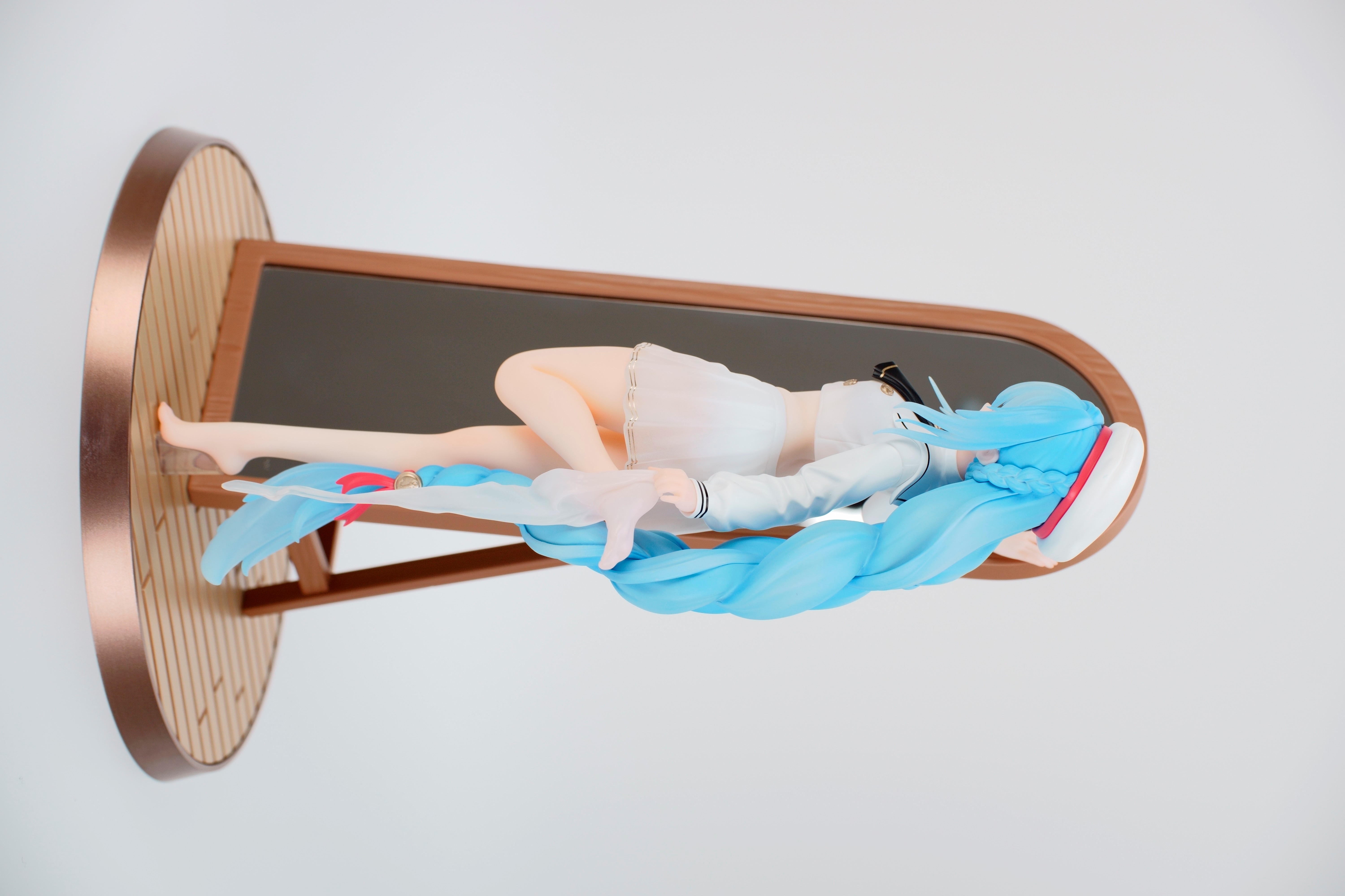 片手を全身鏡に添え、少し困ったような恥ずかしげな表情を浮かべるジェーナスの姿を立体化。へそ出しセーラー服からのぞく素肌は淡く上気し、脱ぎかけの白いタイツから覗く素足は、軽やかに浮かせたポーズで造形。三つ編みの青髪は肩から自然に垂れ落ち、毛先にかけてのグラデーション塗装が透明感を引き立てます。