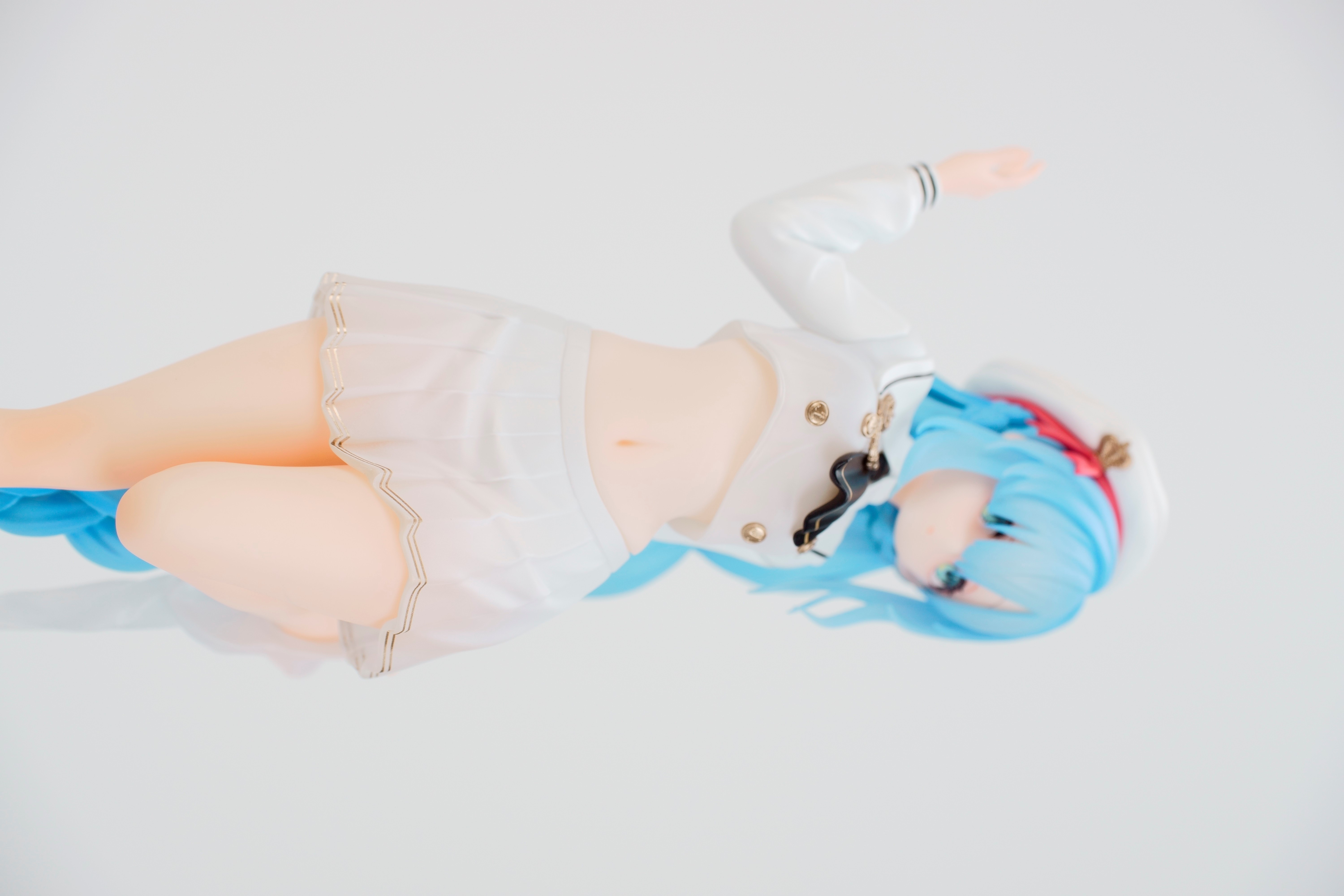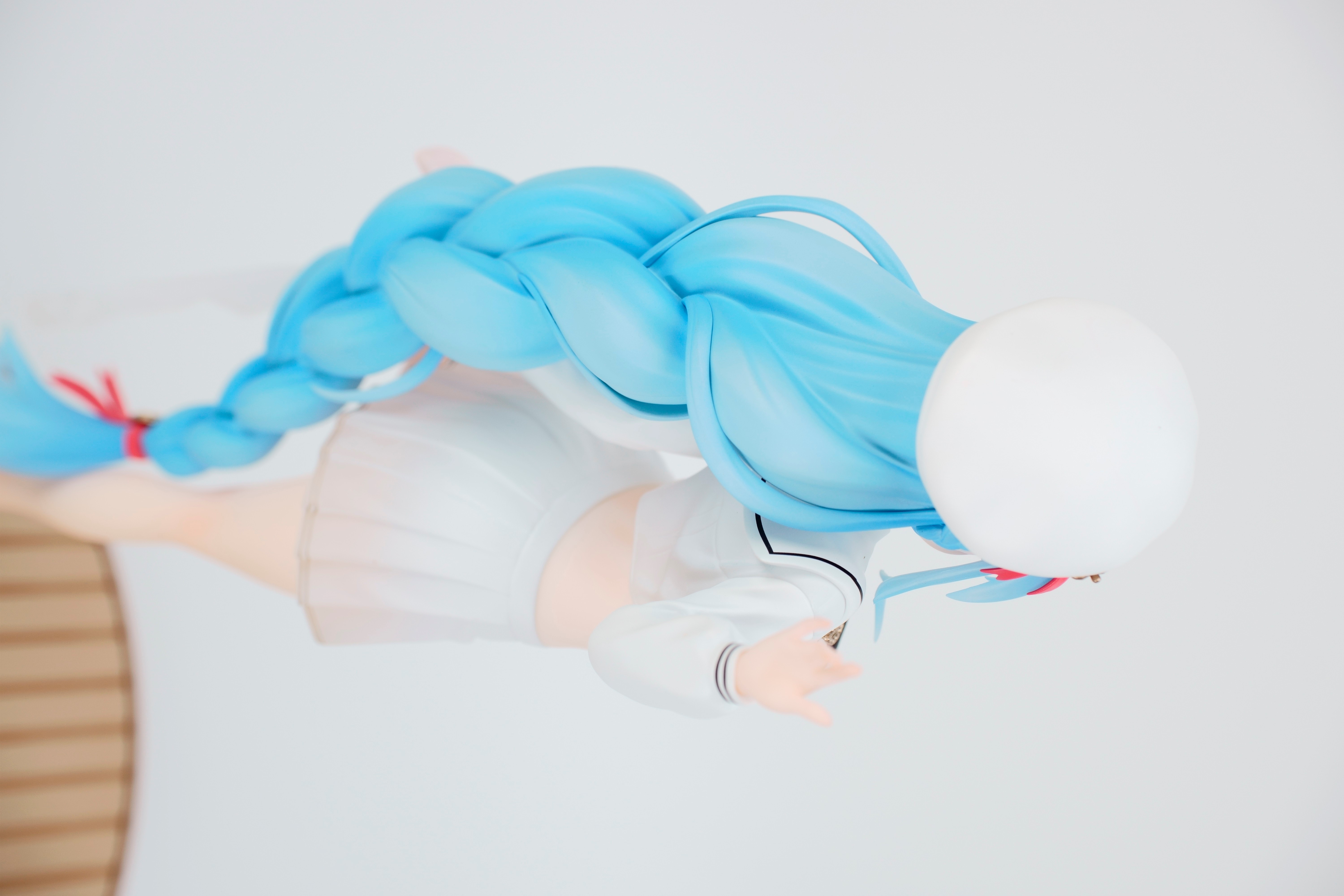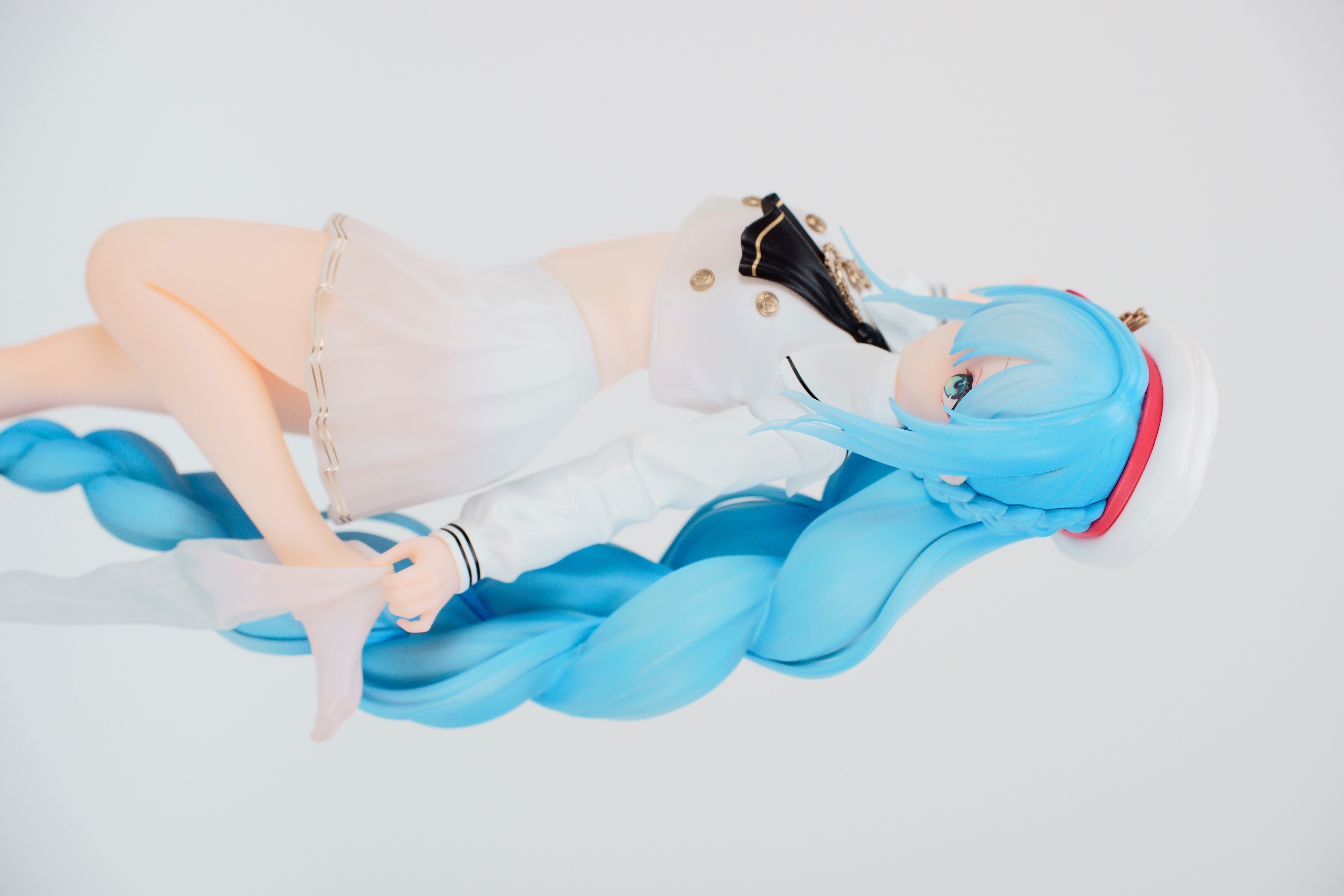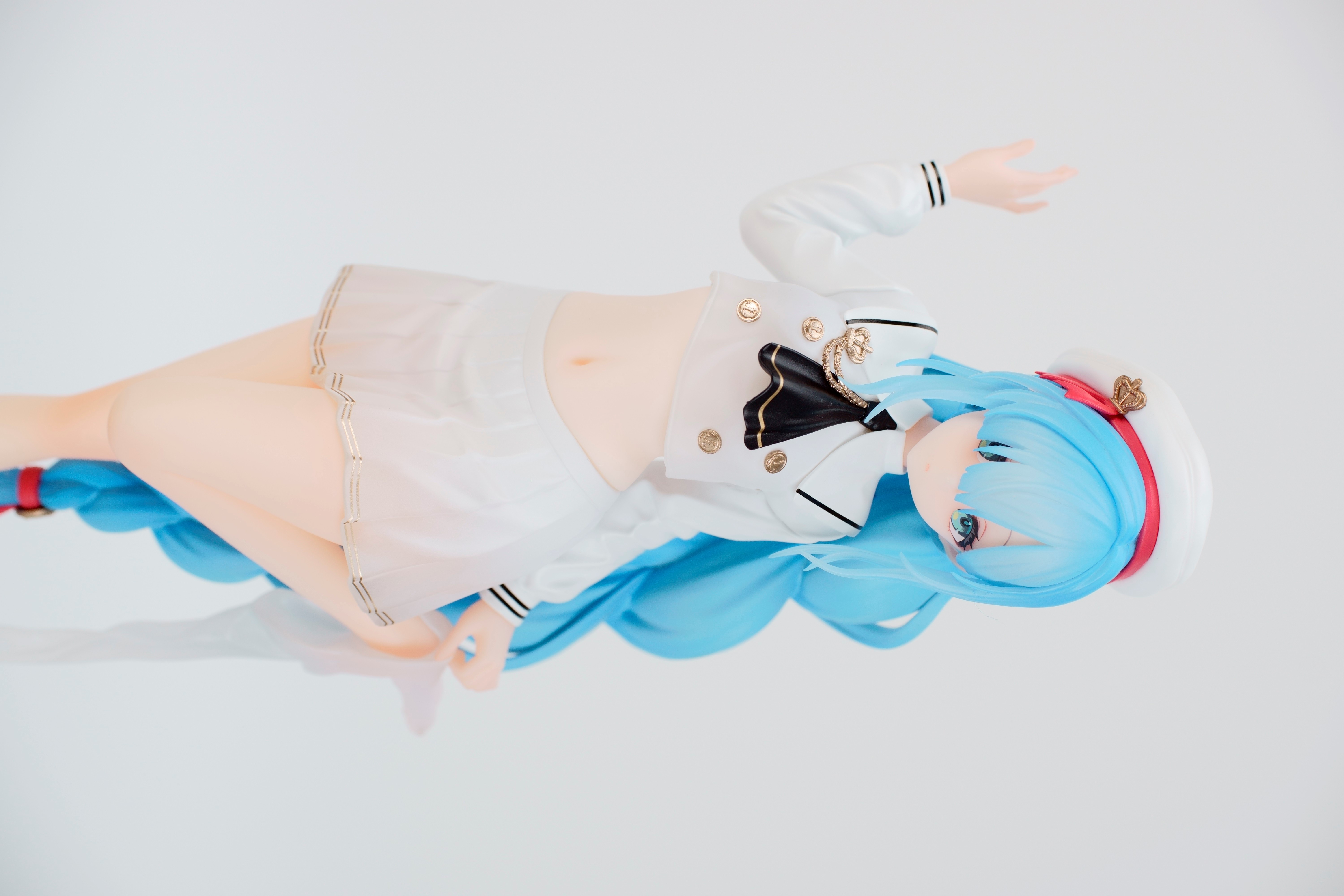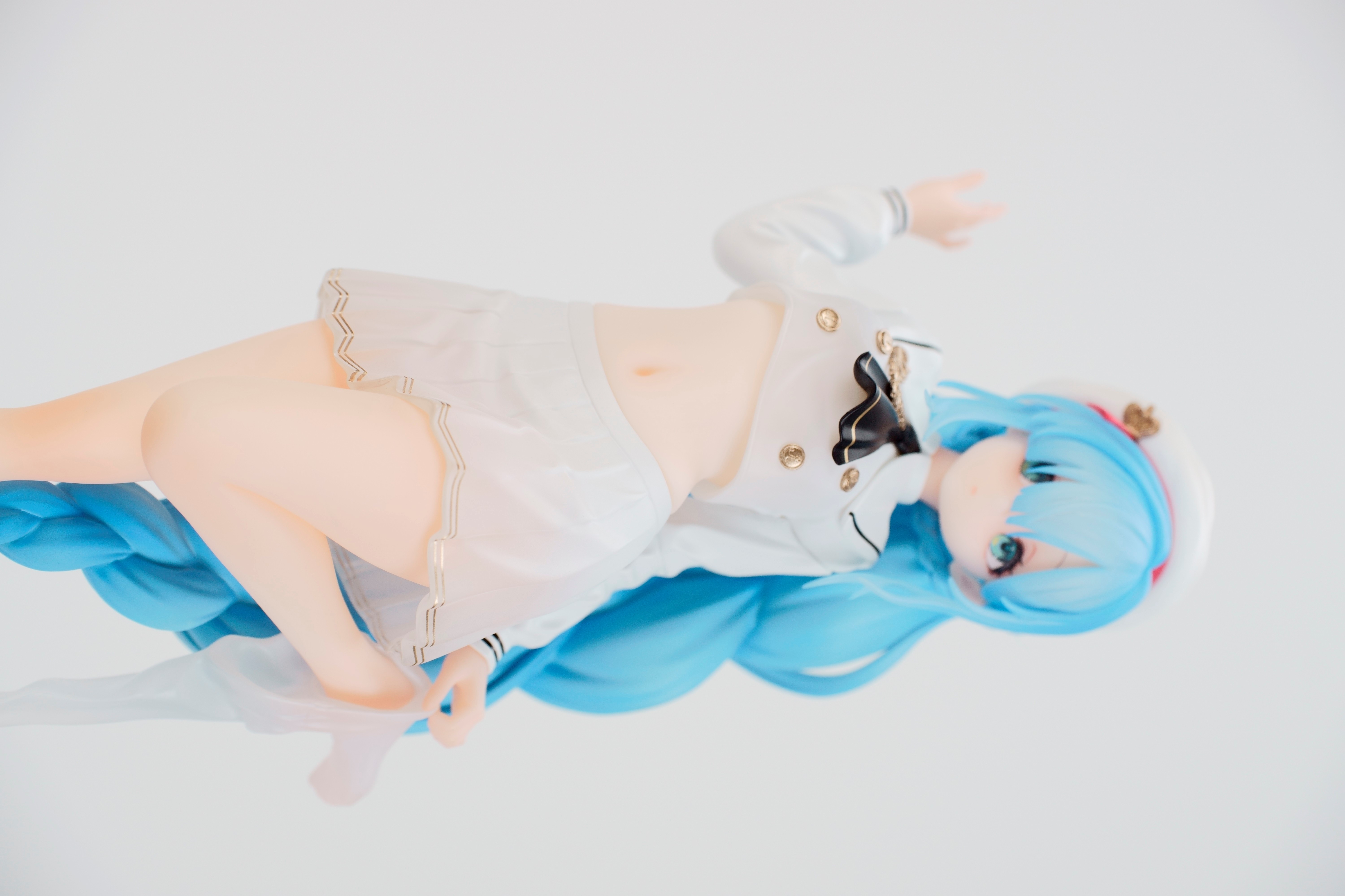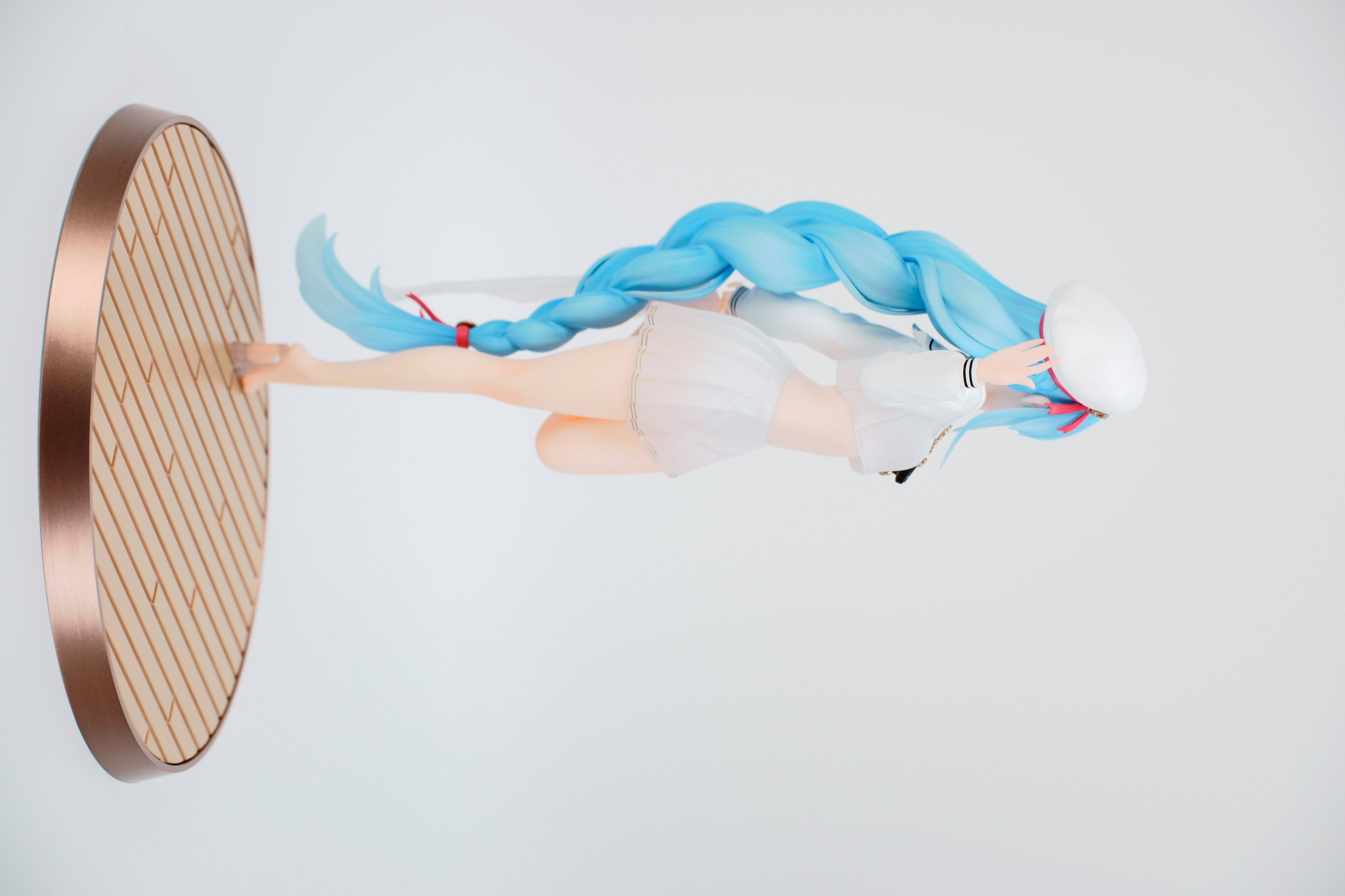 片手を全身鏡に添え、少し困ったような恥ずかしげな表情を浮かべるジェーナスの姿を立体化。へそ出しセーラー服からのぞく素肌は淡く上気し、脱ぎかけの白いタイツから覗く素足は、軽やかに浮かせたポーズで造形。三つ編みの青髪は肩から自然に垂れ落ち、毛先にかけてのグラデーション塗装が透明感を引き立てます。