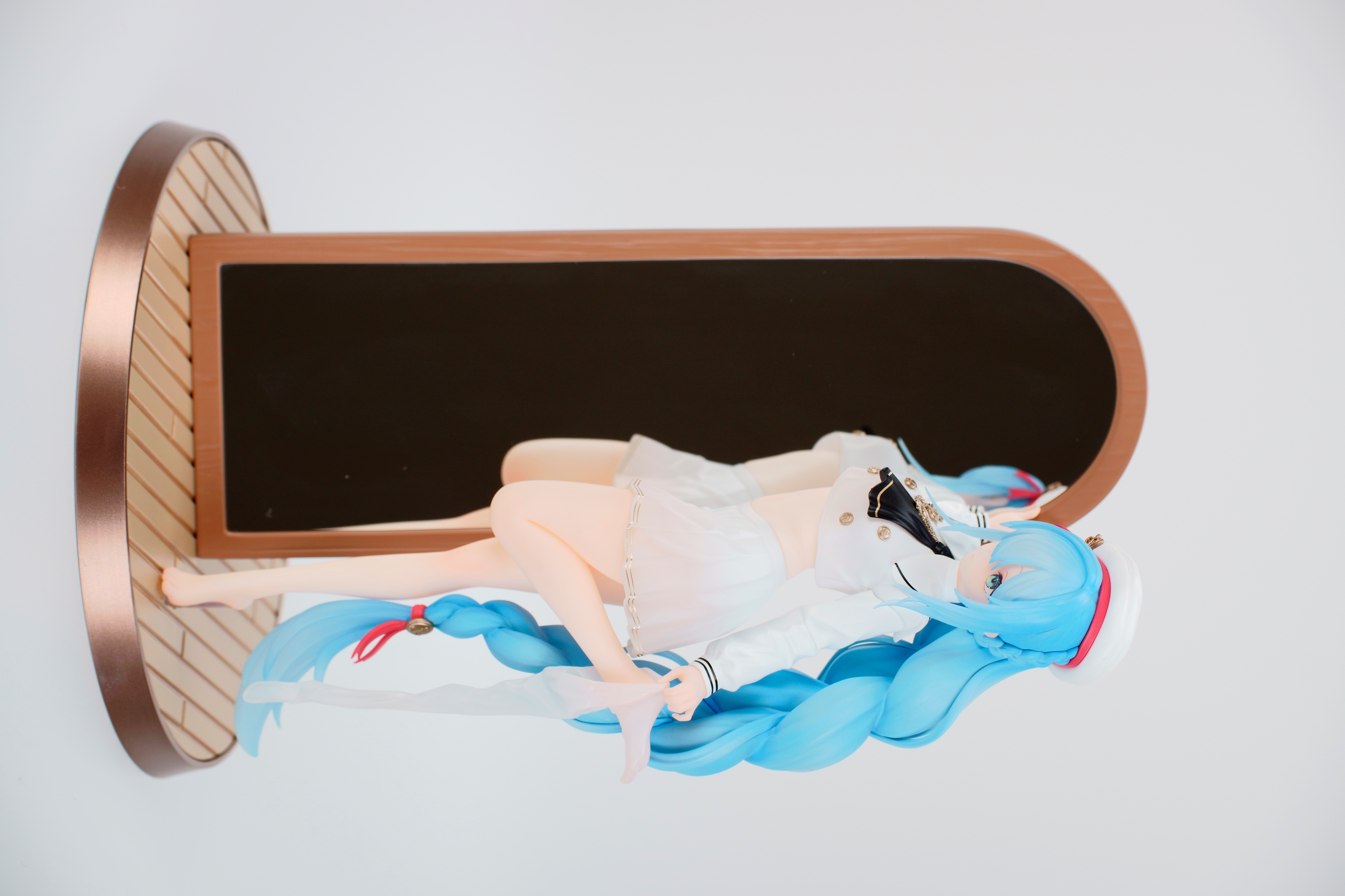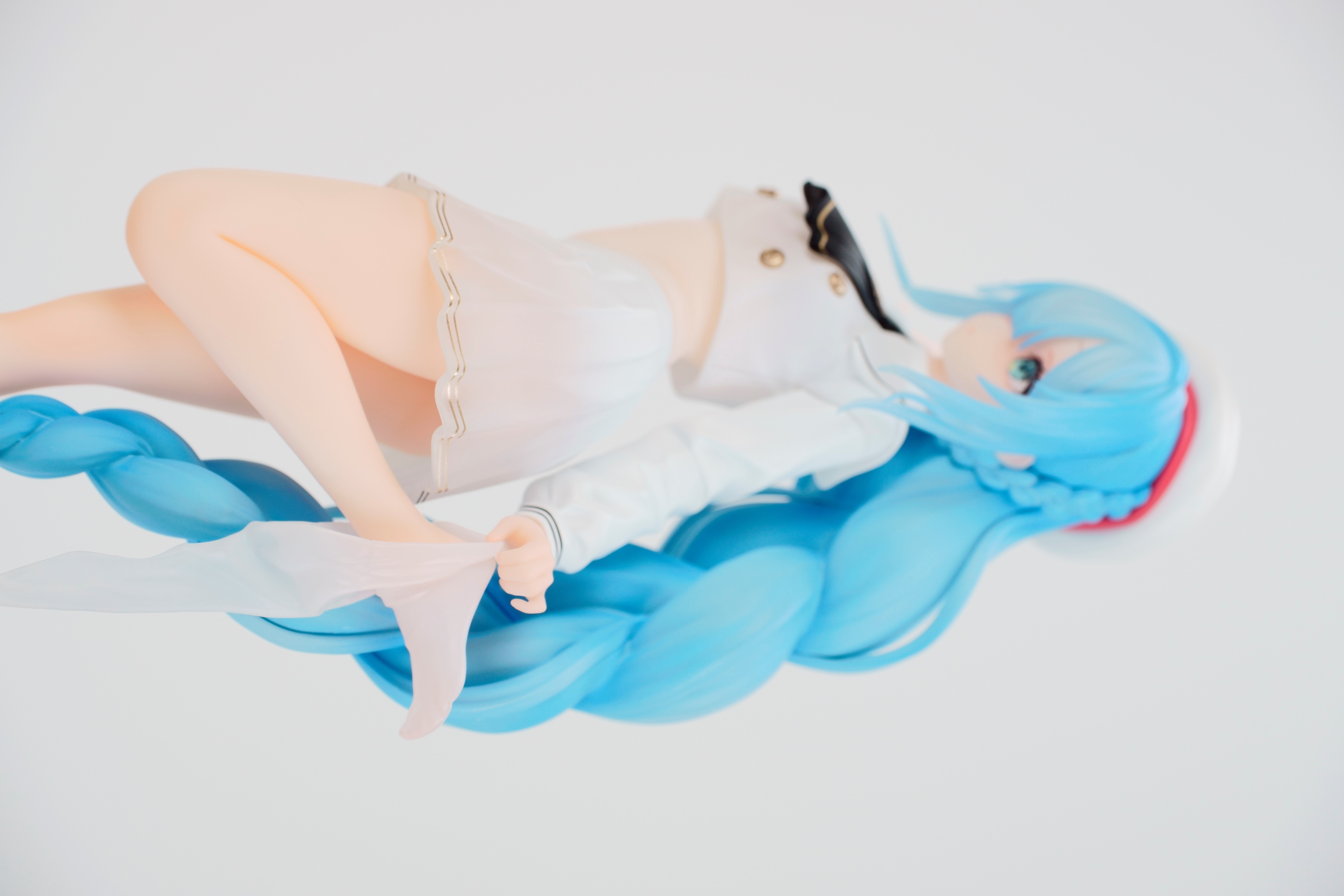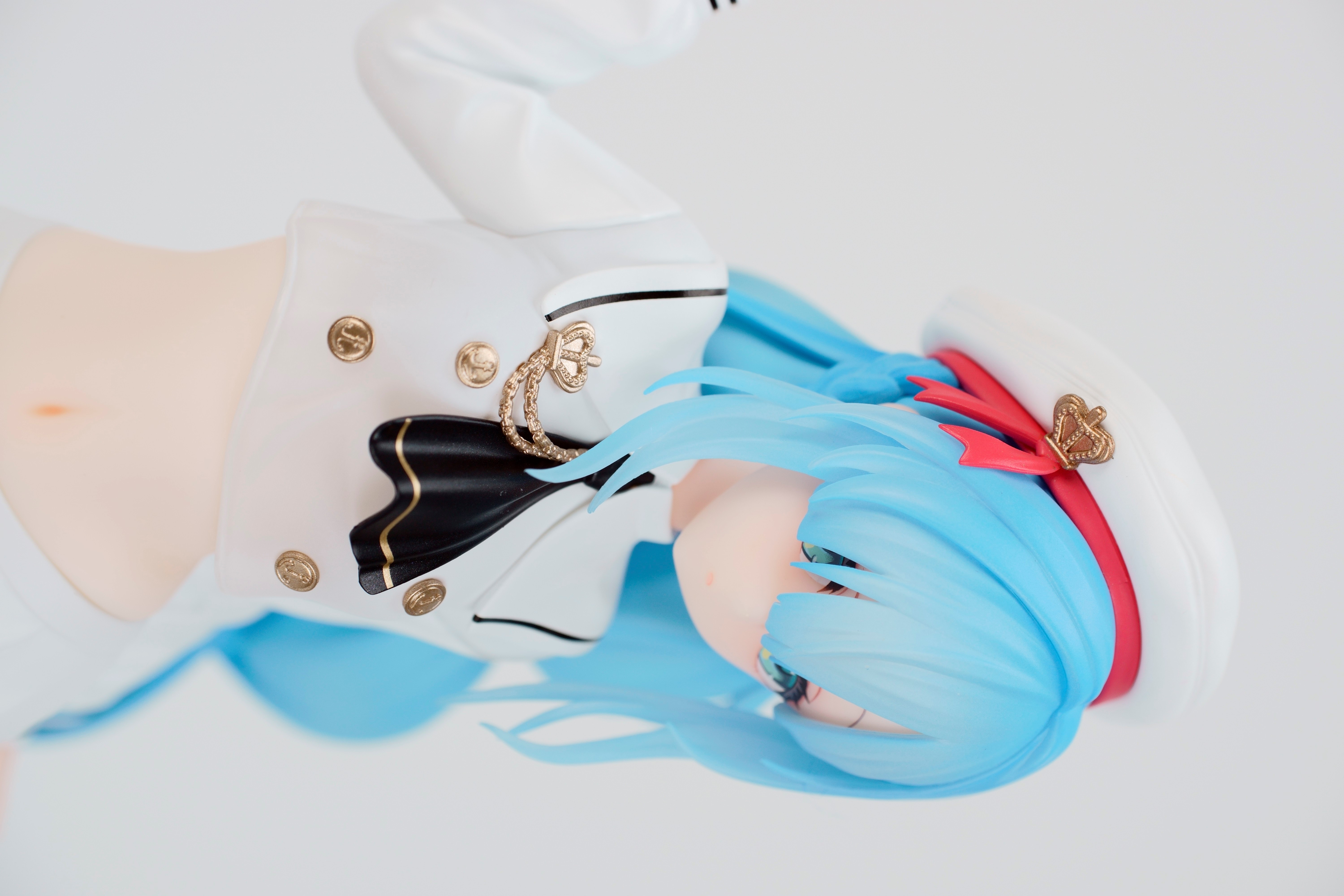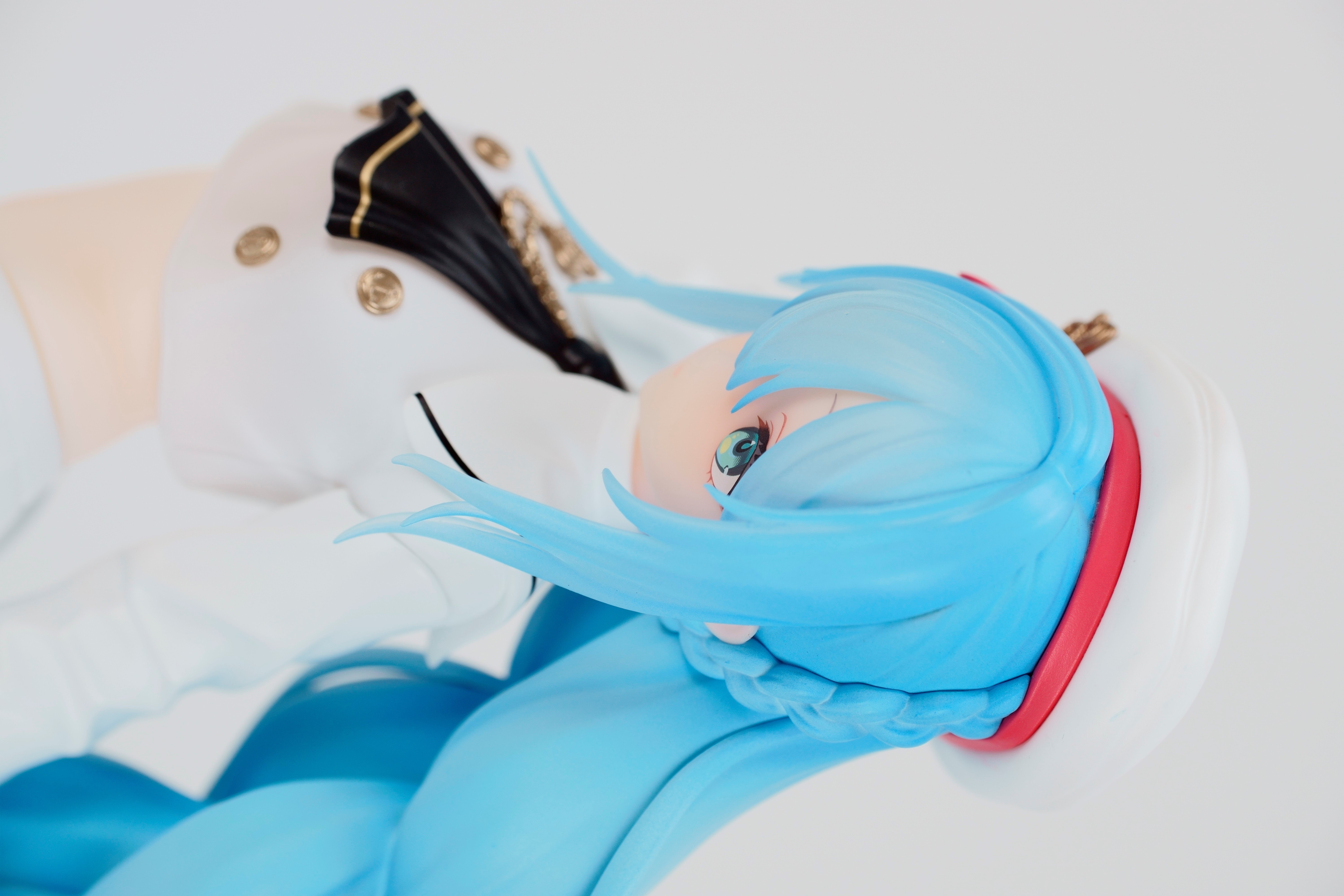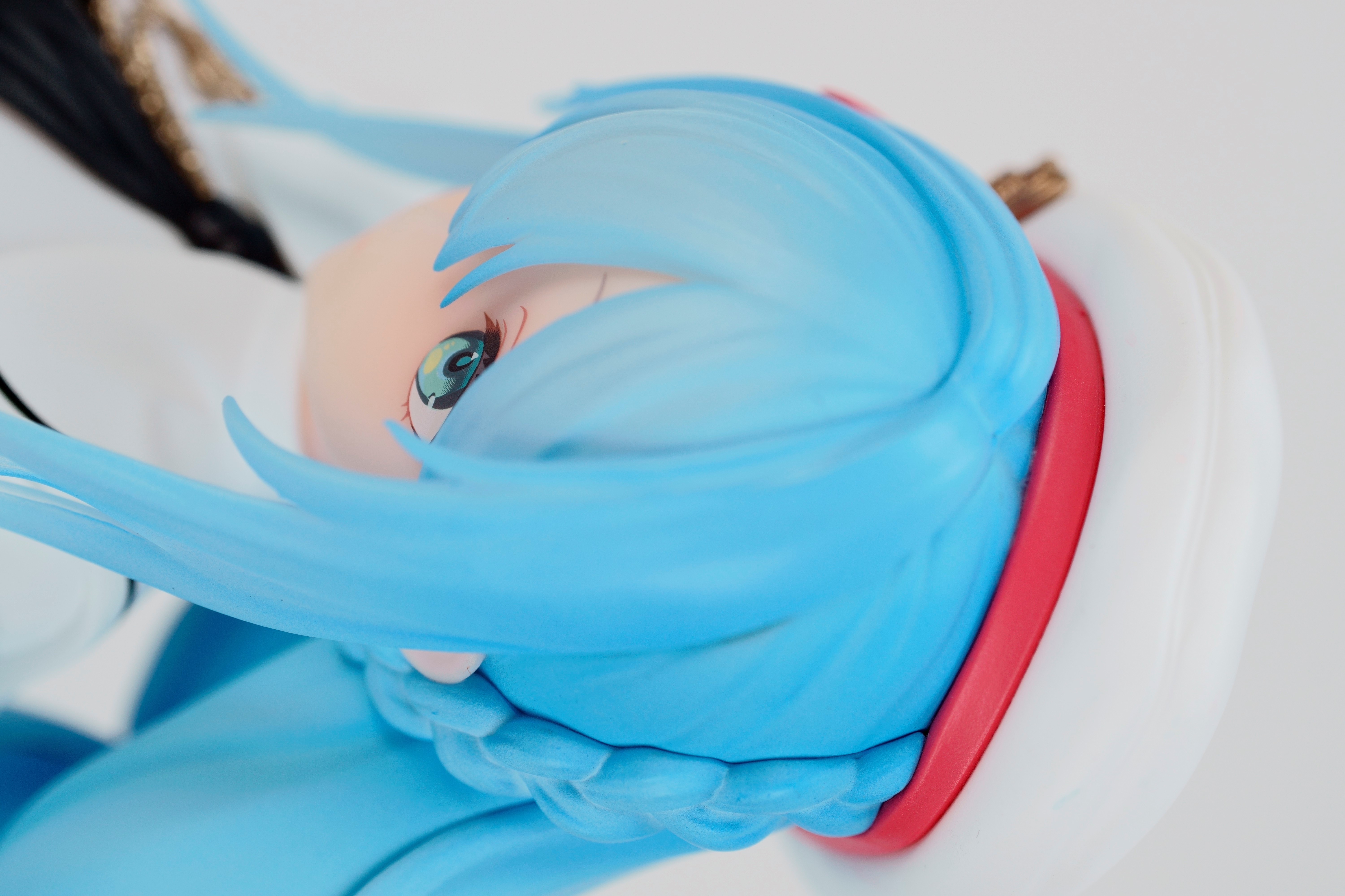 片手を全身鏡に添え、少し困ったような恥ずかしげな表情を浮かべるジェーナスの姿を立体化。へそ出しセーラー服からのぞく素肌は淡く上気し、脱ぎかけの白いタイツから覗く素足は、軽やかに浮かせたポーズで造形。三つ編みの青髪は肩から自然に垂れ落ち、毛先にかけてのグラデーション塗装が透明感を引き立てます。