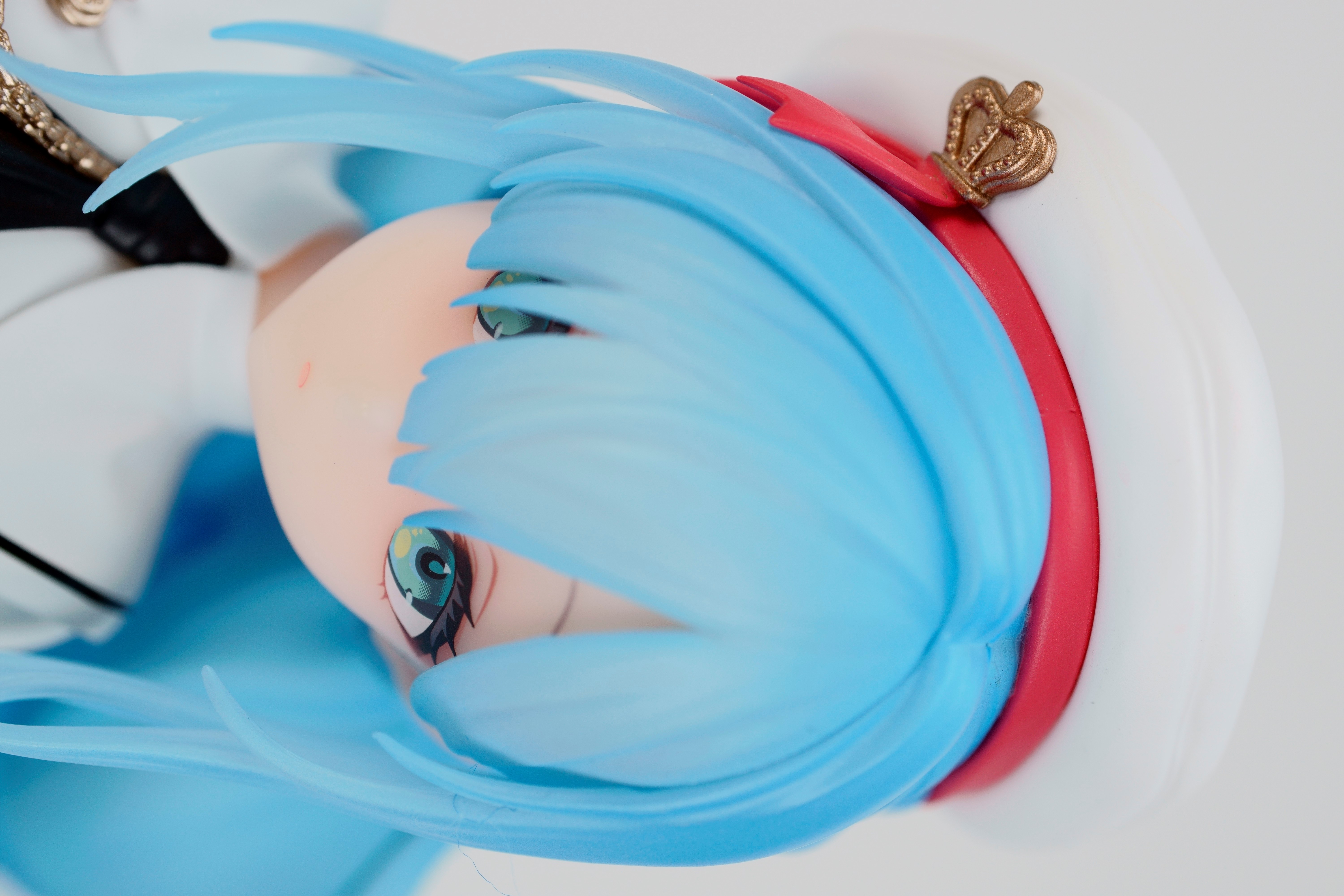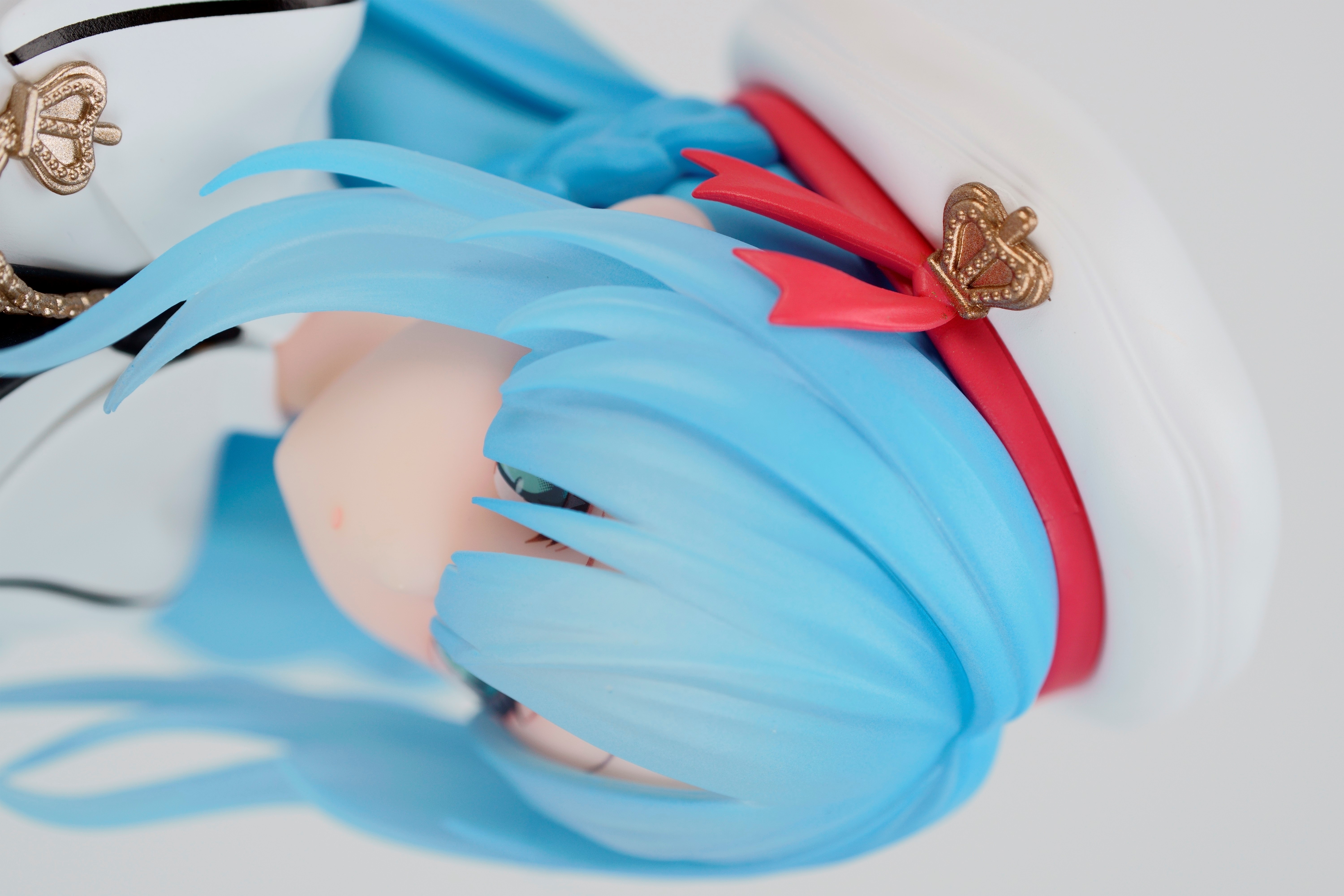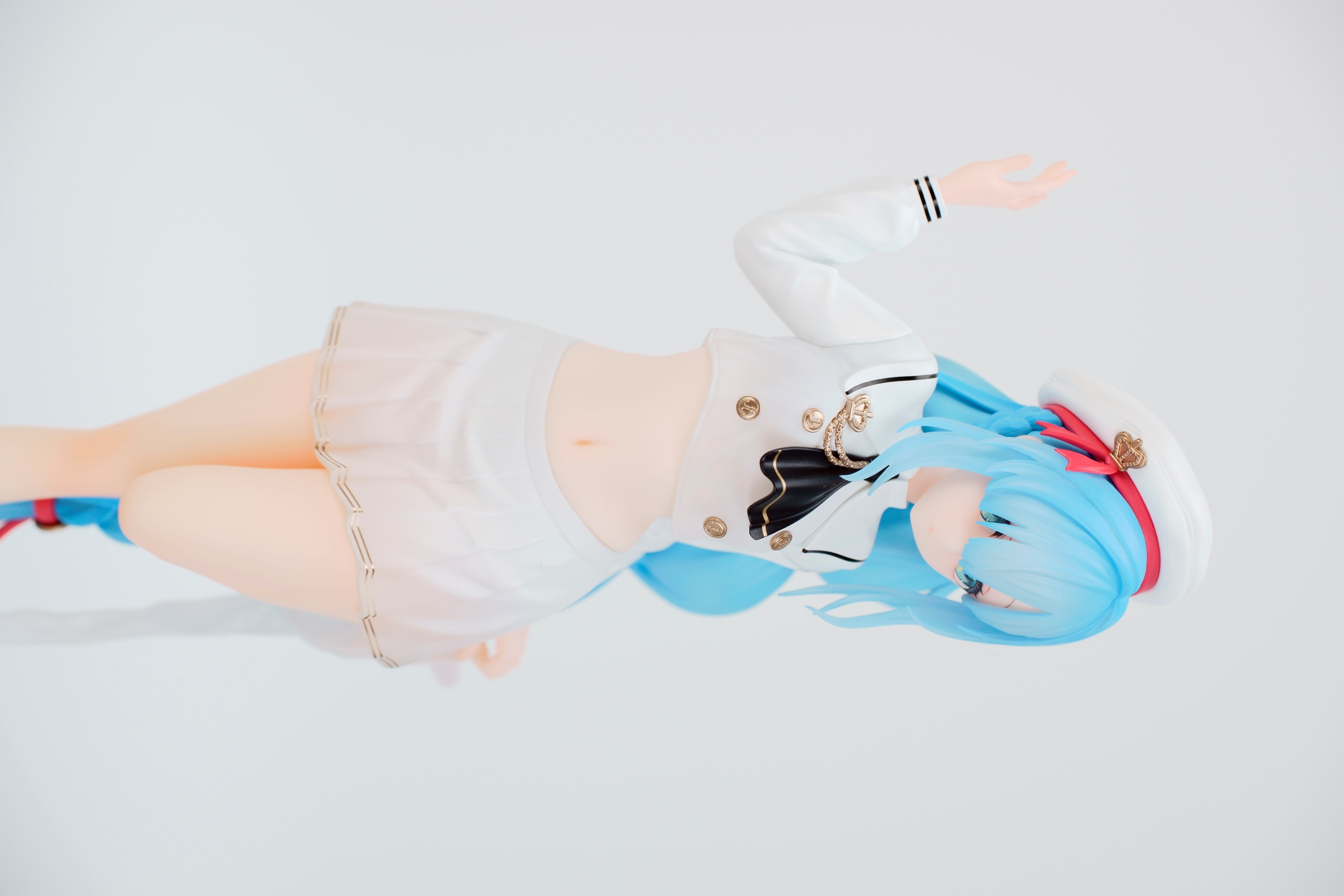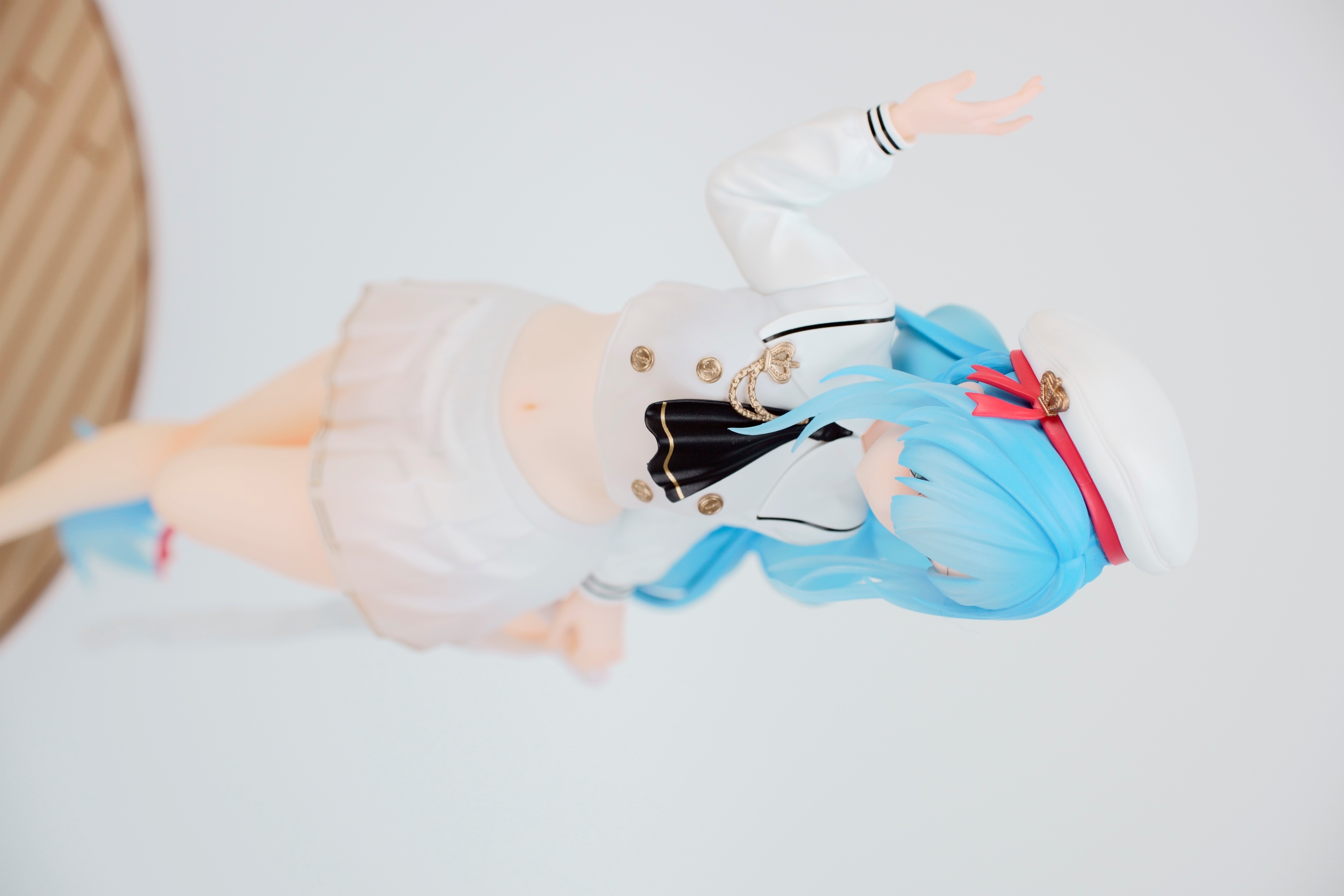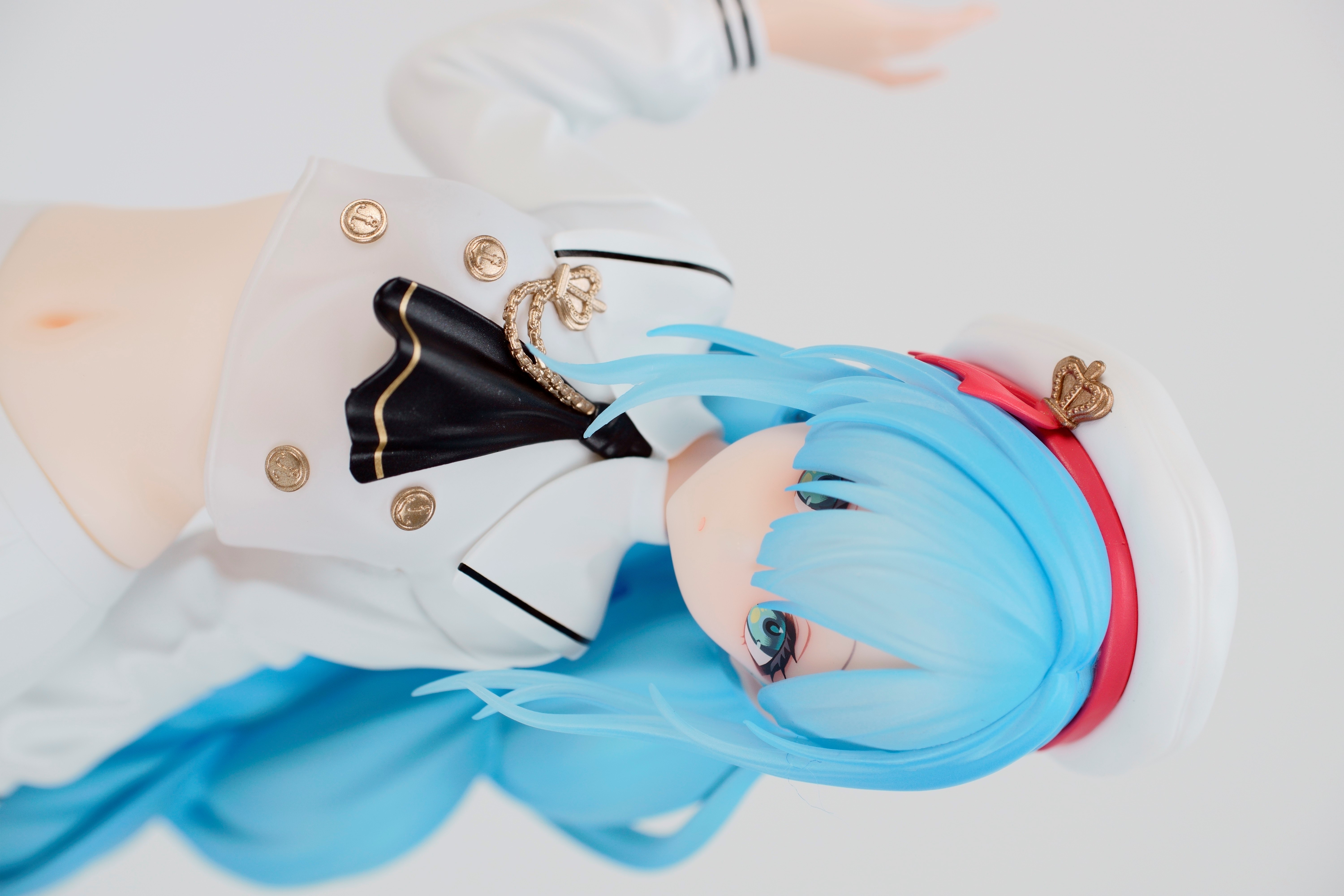 片手を全身鏡に添え、少し困ったような恥ずかしげな表情を浮かべるジェーナスの姿を立体化。へそ出しセーラー服からのぞく素肌は淡く上気し、脱ぎかけの白いタイツから覗く素足は、軽やかに浮かせたポーズで造形。三つ編みの青髪は肩から自然に垂れ落ち、毛先にかけてのグラデーション塗装が透明感を引き立てます。